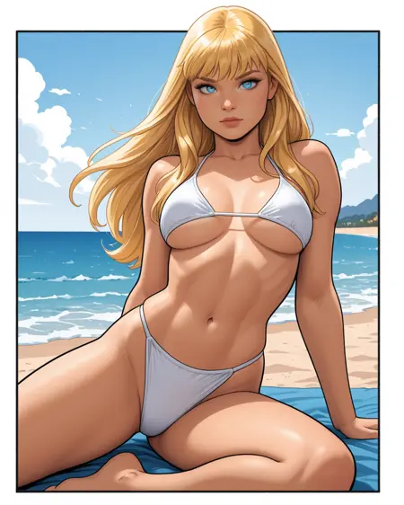 トリガー: magikoriginal, 長い髪, 金髪, 青い目, まっすぐな前髪, ボディスーツ, ベルト, 手袋, 片肩のアーマー, 片手のガントレット, 非対称な脚部装備, 剣, エネルギー剣, ブーツ
