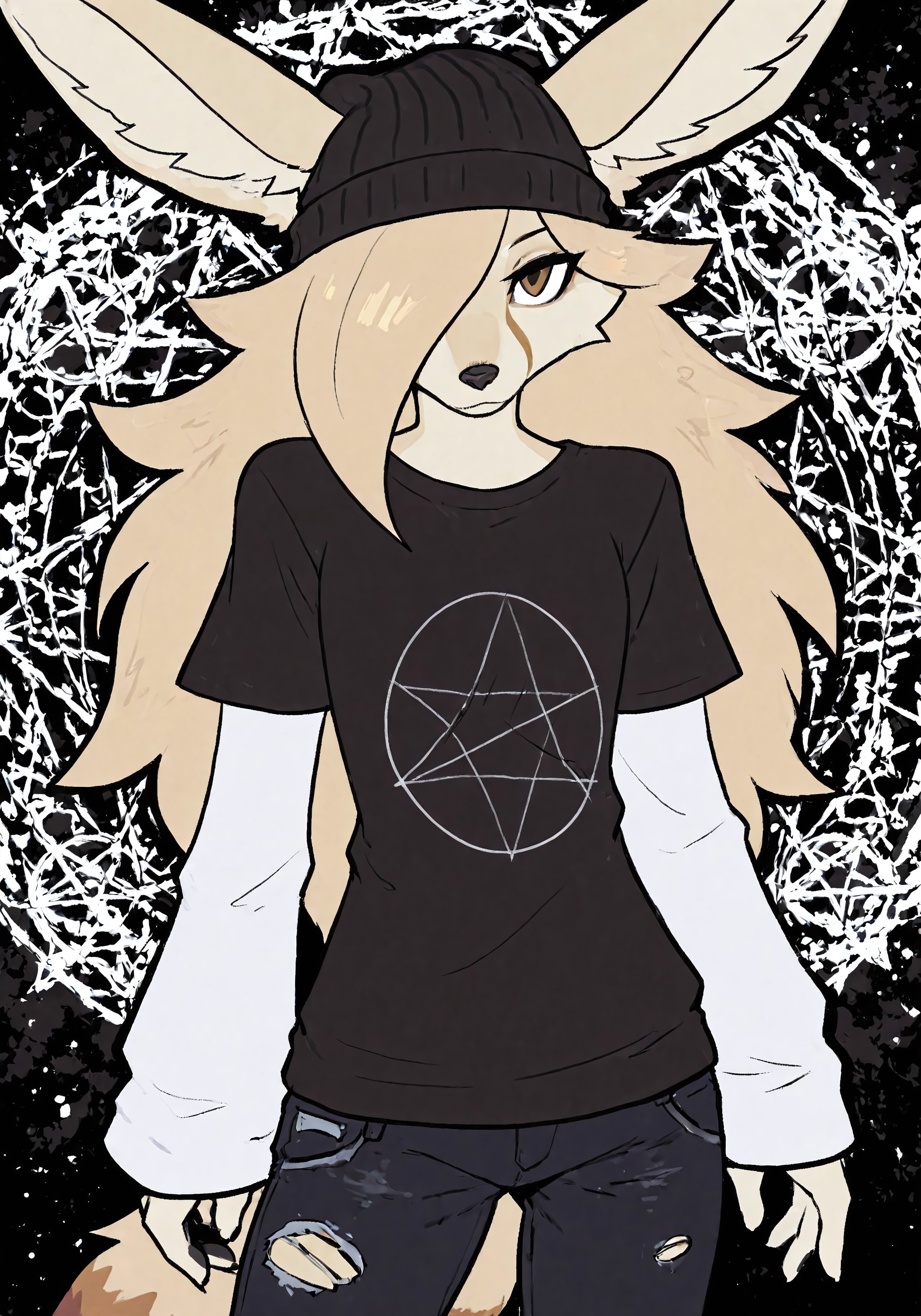 服装提示:黑色衬衫,衬衫上有五角星,长白色袖子,多层衬衫,黑色牛仔裤,紧身牛仔裤,破洞牛仔裤,黑色针织帽