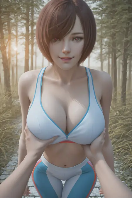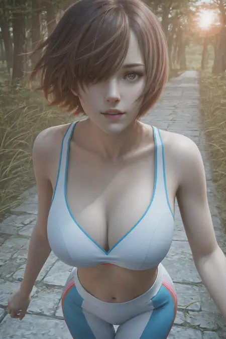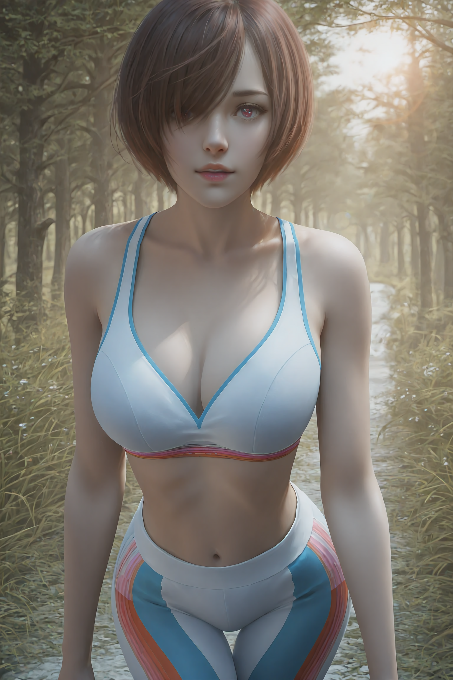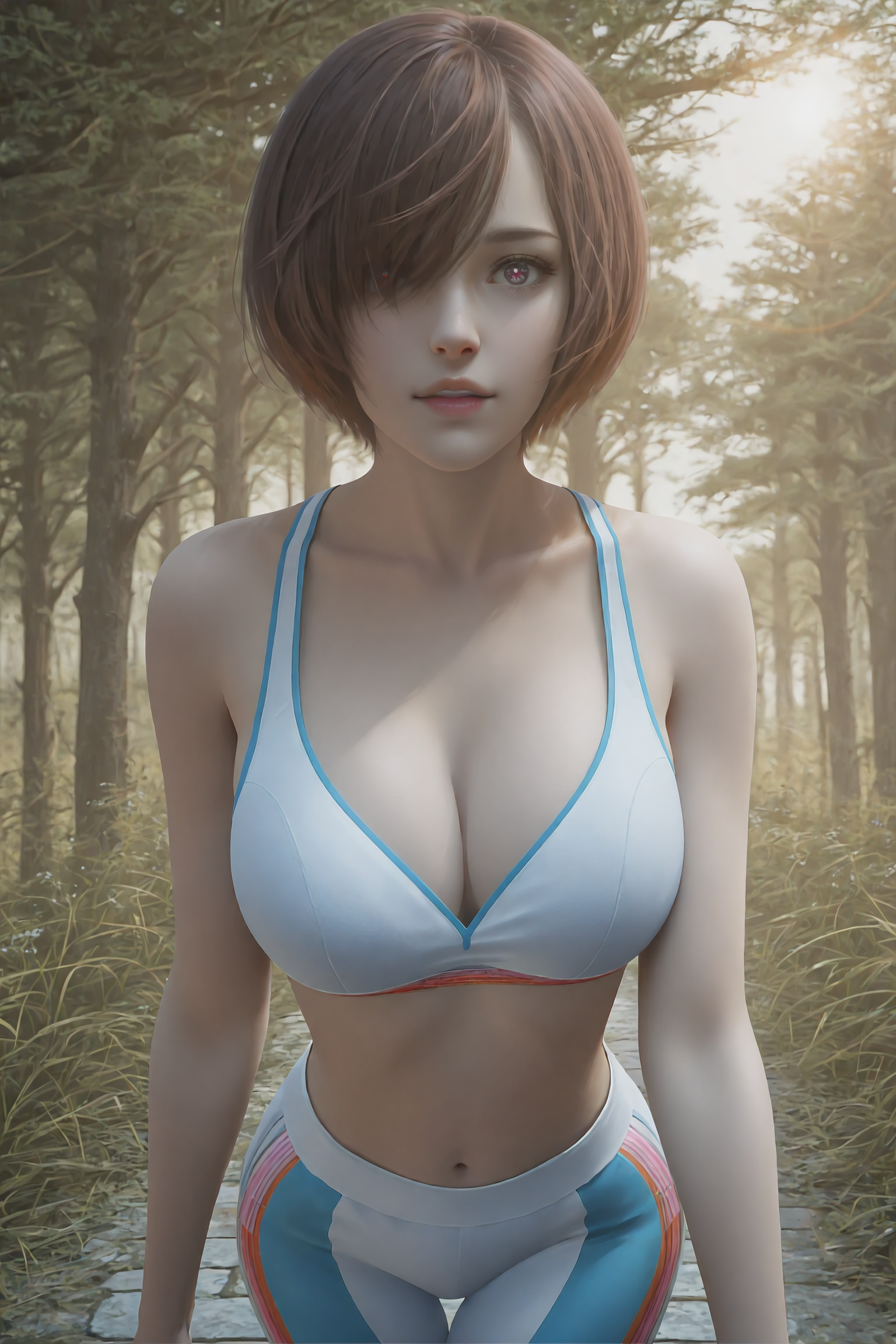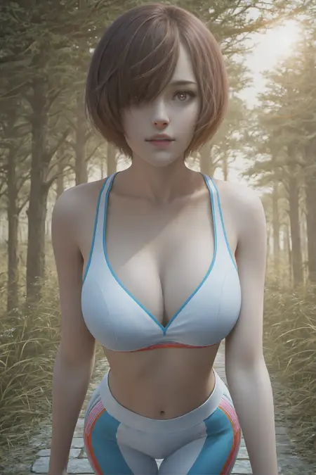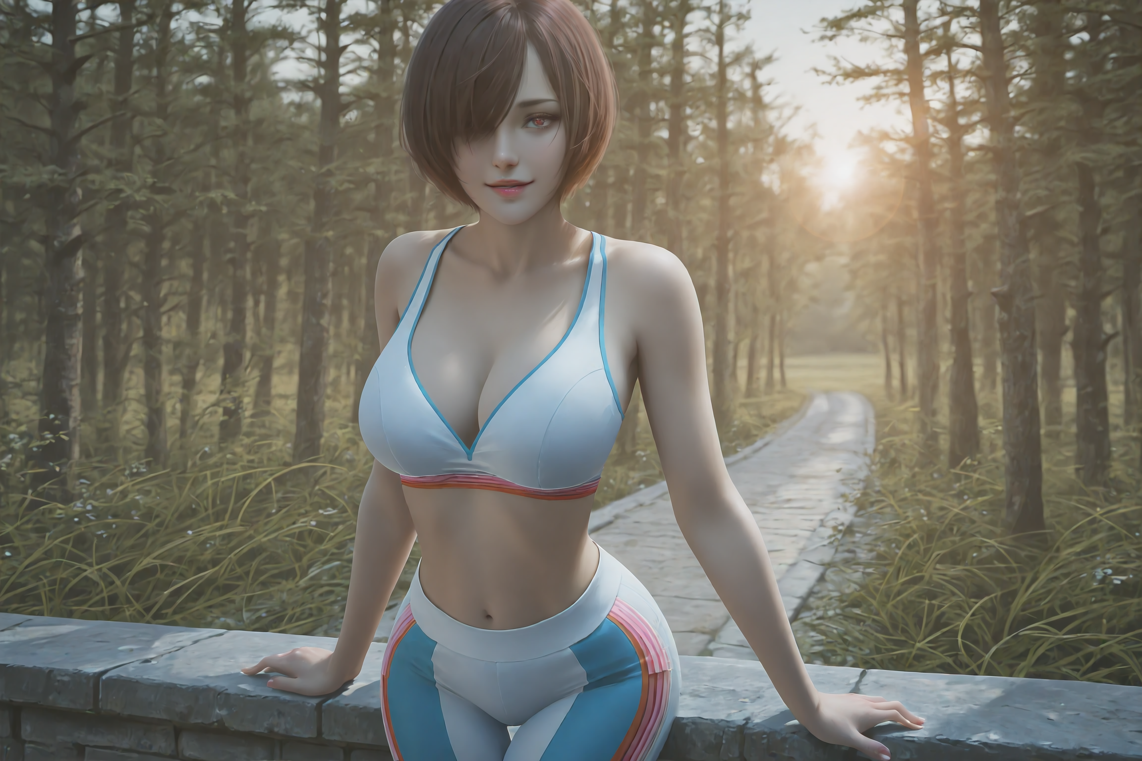 Angela1,brown hair,pants,navel,midriff,hair over one eye,sports bra,lips,thigh gap,short hair,asian