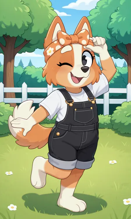 Bingo_Heeler_(Bluey series), orange fur, Two-tone fur, anthro dog, black eyes, fluffy tail