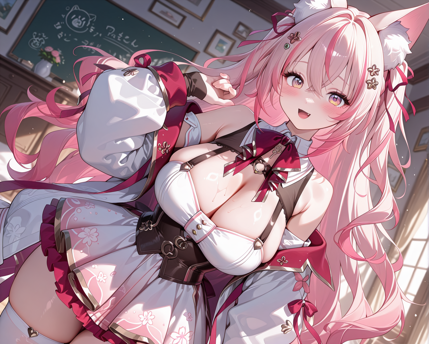 | トレーニングワード | 1girl,pink hair, animal ears, hair ornament, gradient eyes,detailed eyes, streaked hair, gradient hair,コピーしました! large neck ribbon, cleavage,white sailor collar,corset,bare shoulders, detached sleeves,layered skirt,mini skirt, gradient pink skirt, see-through clothes, white thighhighs, brown collar,white collar, no jacket, heart o-ring, strap,コピーしました! |