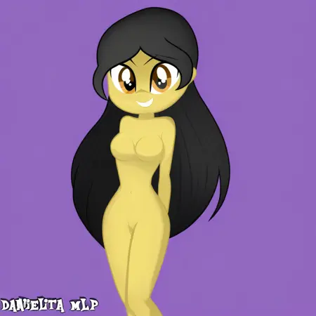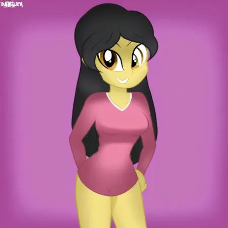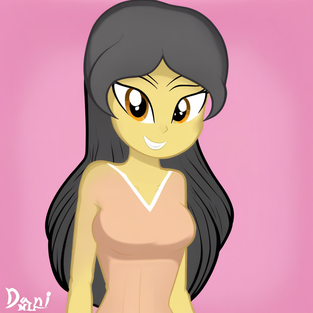 Dani Melody, OC, equestria girls, big breasts, black hair, light orange skin, amber eyes