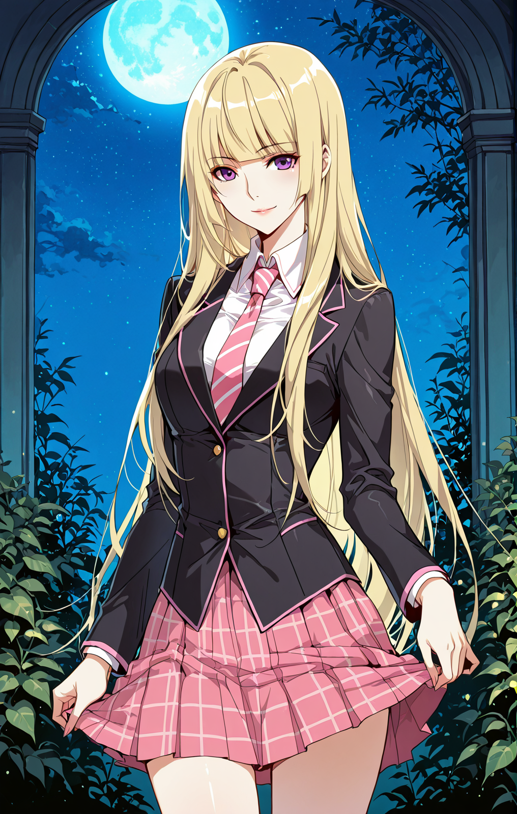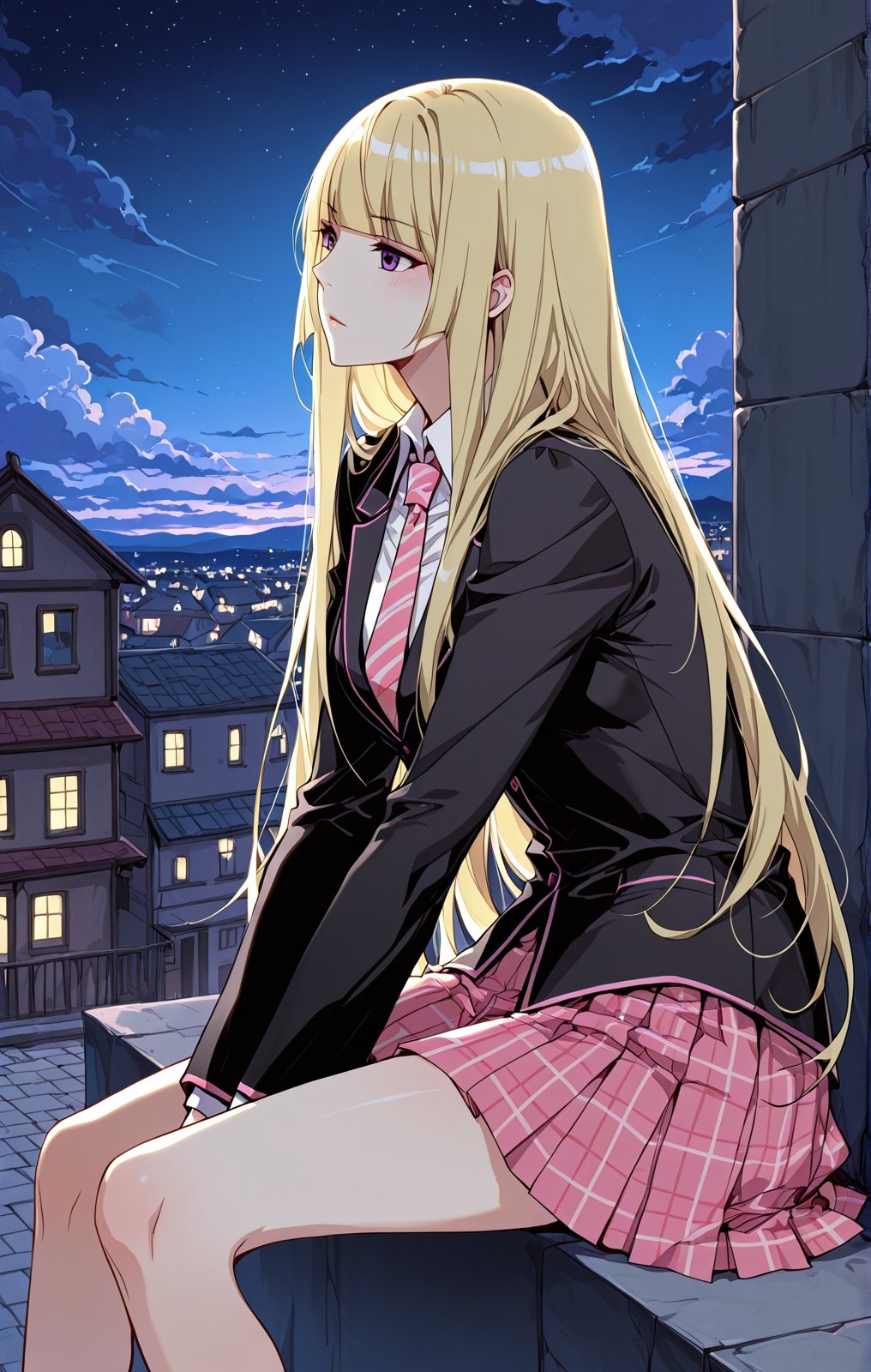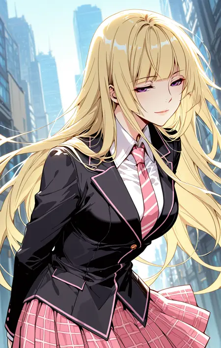 Ingyi_服装,黑色西装外套,粉色边饰,长袖,白色衬衫,高领,有领衬衫,长袖衬衫,粉红色条纹领带,粉色裙子,格子裙,百褶裙,