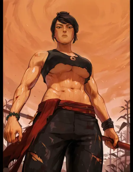 方形吊坠或项链,无袖上衣,护腕,红腰带,裤子,手镯,腕带,