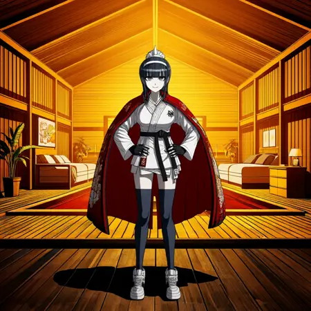 来自《百线:最后防卫学院》的Kyoshika Magadori,由Komatsuzaki Rui绘制的官方艺术风格呈现。她黑色的长发柔顺飘逸,前额有锐利的齐刘海,两侧细碎发束衬托面部,后方扎成整洁的马尾,由白色发带固定。她拥有灰色的眼眸,身着传统的白色道衣,长袖设计露出锁骨,腰间系着一条醒目的黑色腰带。肩上披着红色披风,鲜艳的红色内衬与外部复杂的图案形成对比——披风和道衣上均饰有精致的花卉印花和风格化人物,并醒目地印有日文汉字。双手佩戴黑色露指手套。道衣下方穿着紧身的黑色过膝长筒袜,向上延伸。脚上是灰色高帮运动鞋。胸前垂挂着一条链条项链。
