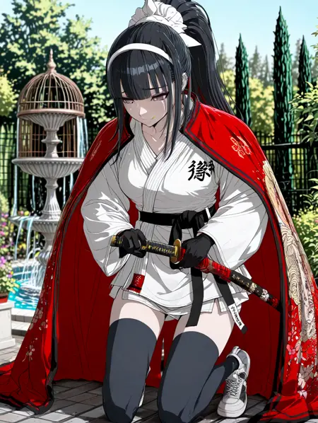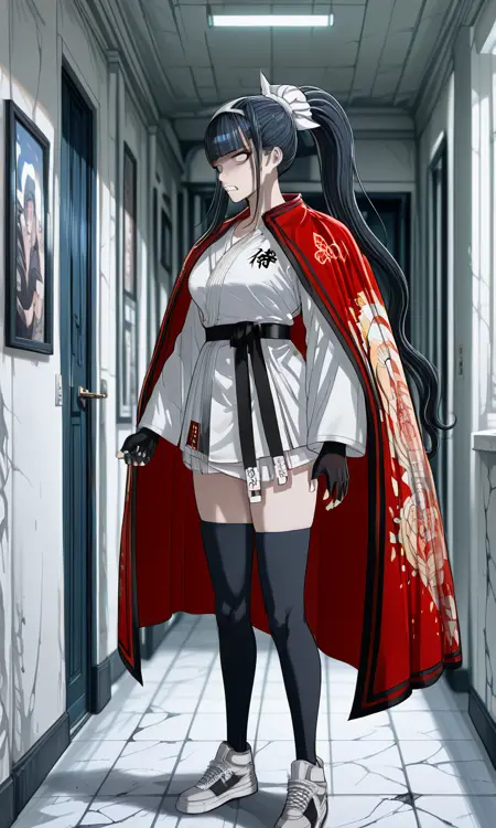 Kyoshika Magadori from The Hundred Line: Last Defense Academy, rendered in official art by Komatsuzaki Rui. Her black hair, long and flowing, is styled with sharp blunt bangs, delicate sidelocks framing her face, and gathered into a neat ponytail, secured by a white hairband. She has grey eyes and wears a traditional white dougi with long sleeves, revealing her collarbone, cinched at the waist by a stark black belt. Draped over her shoulders is a red cape, its vibrant red lining contrasting with the intricate patterned outer surface that boasts elaborate floral prints and stylized figures with Japanese kanji prominently displayed on both the cape and her dougi. Her hands are adorned with black fingerless gloves. Beneath her dougi, she wears form-fitting black thighhighs, extending upwards. Her footwear is grey high-top sneakers. A chain necklace rests against her chest.