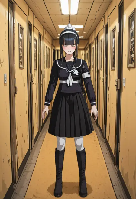 Kyoshika Magadori from The Hundred Line: Last Defense Academy. Her very long black hair is styled into a neat ponytail, accented by blunt bangs and delicate sidelocks that frame her face, all held in place by a pristine white hairband and topped with a distinctive spiked hair ornament and contrasting against her pale skin. Her grey eyes are intensified by red eyeliner. She is clad in her last defense academy uniform, a black serafuku featuring a classic black sailor collar with crisp white trim that also adorns the cuffs of her long sleeves. A white neckerchief is neatly tied at her throat, complemented by an intricate chest ornament: a brooch featuring a white emblem. A peculiar and explicit detail is the prominent hole in her chest, a stark opening on her body that reveals the white bodysuit worn underneath her uniform. Her collarbone is visible beneath the fabric of her black shirt, which is cinched by a slender white belt above a black pleated skirt. She wears white gloves on her hands, a white armband on her left arm, and sturdy black knee boots.