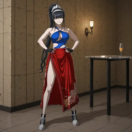 Kyoshika Magadori from The Hundred Line: Last Defense Academy in the art style of Komatsuzaki Rui,. Her pale skin contrasts against her very long black hair styled meticulously with blunt bangs, framing her face with graceful sidelocks, while the bulk of her hair is swept back into a high hair bun and a long ponytail, adorned with a pristine white hairband. Her grey eyes compliment a soft blush across her cheeks.Her bare shoulders are exposed in an alluring blue swimsuit featuring a halterneck with criss-cross straps, a bold cleavage cutout, and an additional cutout that exposes her midriff. The lower part of her ensemble comprises an asymmetrical, draped side skirt in the same vibrant blue cascading down her leg. She wears sleek black fingerless gloves on both hands and is barefoot.