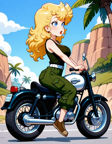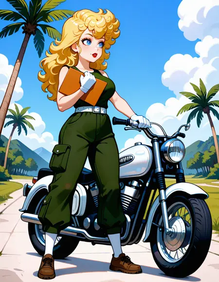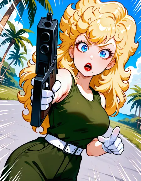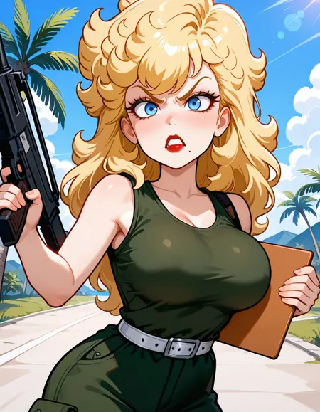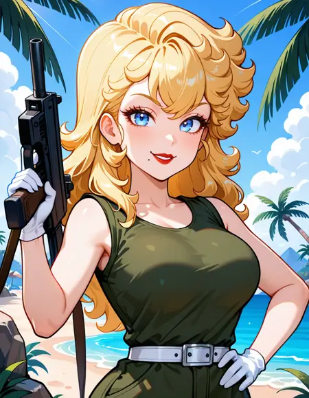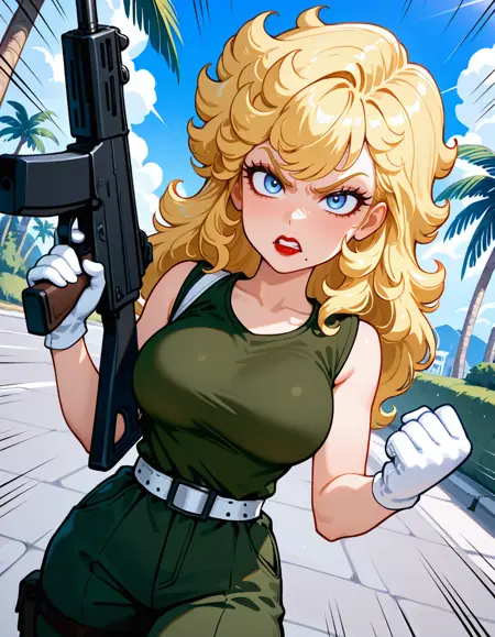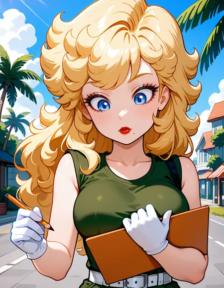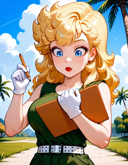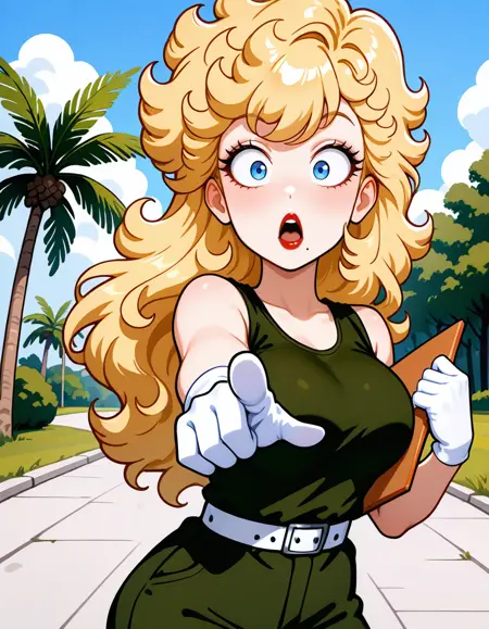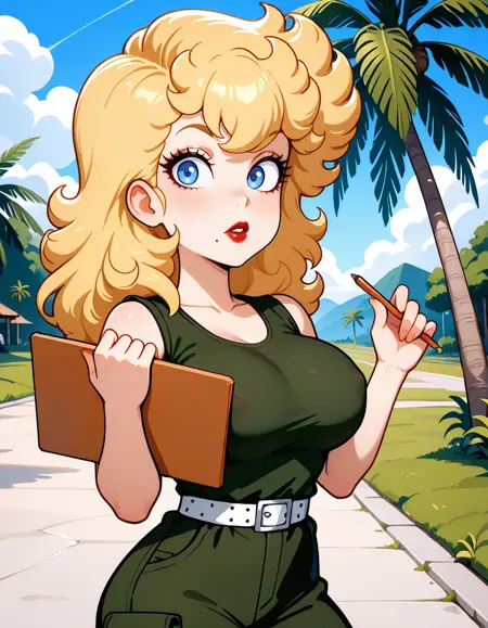 | Trained Words | (official style:0.6), (polly-buckets, blue eyes, eyelashes, blonde hair, curly hair, long hair, red lips, mole under mouth, large breasts), (green sleeveless shirt, white belt, green cargo pants, white gloves, white calflet, brown sneakers)Copied! |