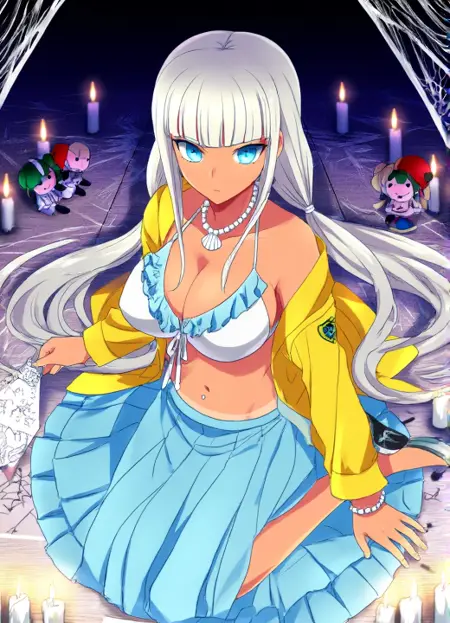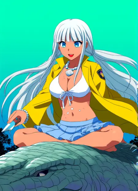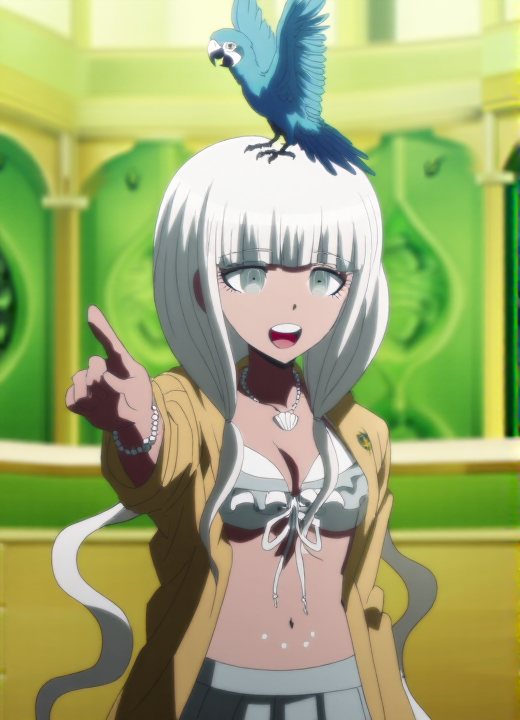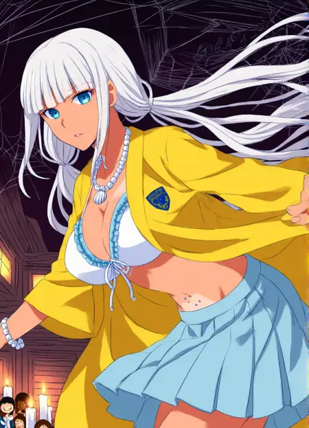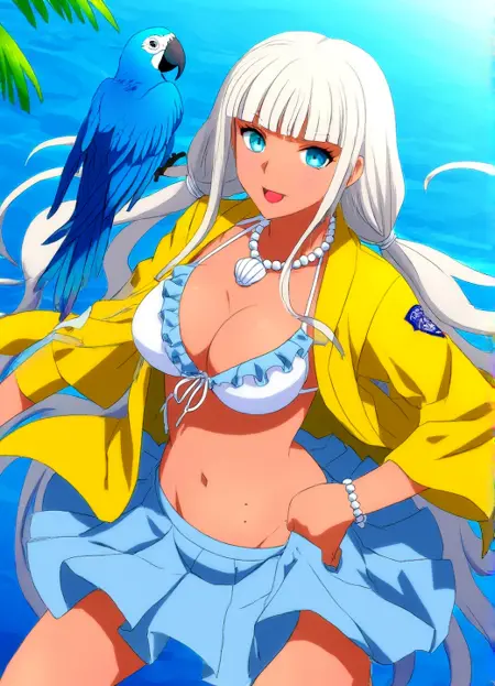 yonaga_angie, Angie Yonaga, aesthetic 9, A dynamic anime illustration of Angie Yonaga in a modern anime art style with exceptionally clean sharp linework smooth digital gradients for shading and vibrant saturated colors that create a polished high-contrast look. The character designs are stylized with expressive features and flowing hair. Angie Yonaga wearing her uniform from Danganronpa V3. She has tanned skin. Angie's hair is pale silver-white, extremely long and straight. She has blunt-cut bangs that sit right at eyebrow level. Her hair is parted in the center and is pulled into two thin loose, wavy front ponytails which end shortly below her chest. Her hair in the back ends at neck length. Angie is wearing a white bikini top with pale blue frills and a white beaded necklace with a seashell pendant. Angie is also wearing a yellow smock over her white bikini top and pale blue skirt, with her school's crest on the smock's shoulders. She has a white beaded bracelet on her left wrist. Angie has blue eyes. There are three dots surrounding her belly button.