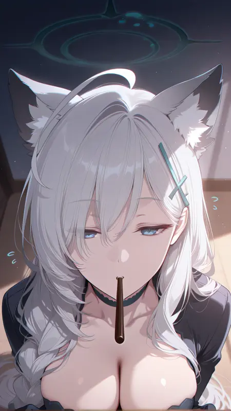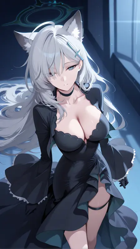 タグ:1girl、単体、前髪、長い髪、動物の耳、髪飾り、青い目、動物の耳のふわふわ、ハロ、灰色の髪、あほ毛、十字型の髪飾り、