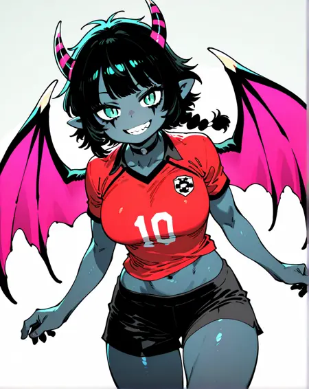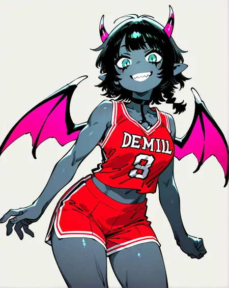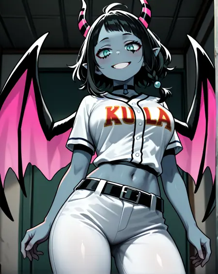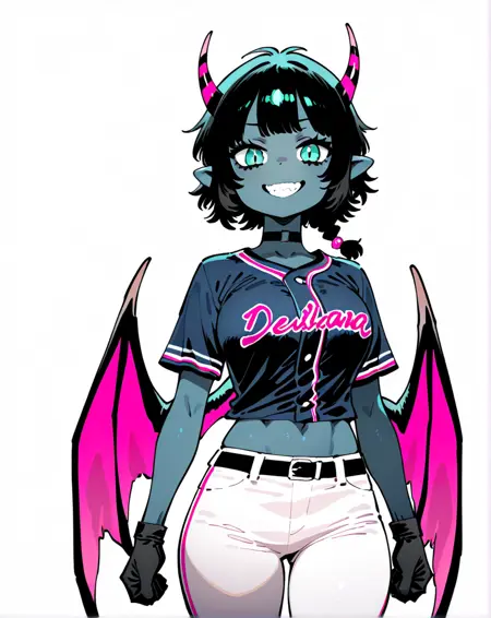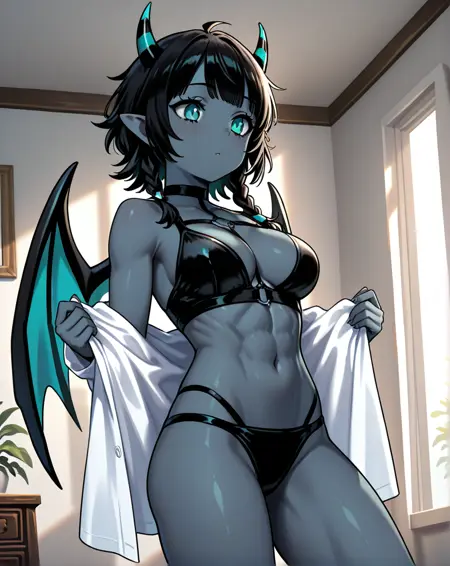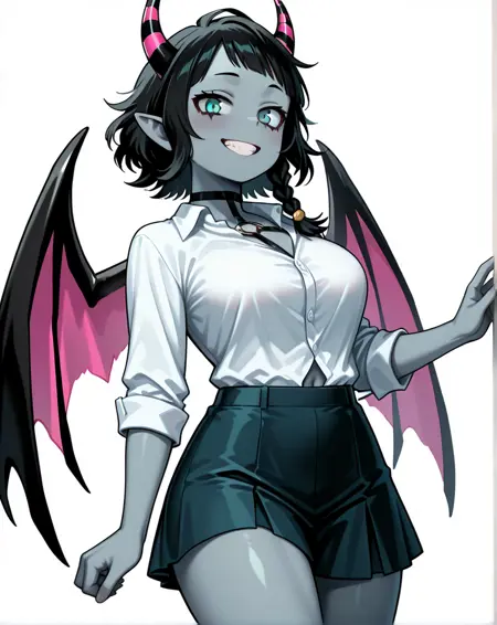 Recommended prompt : 1girl, medium hair, devil teeth, black hair, horns, navel, pointy ears, aqua eyes, single_braid, colored skin, demon girl, o-ring_choker, slit_pupils, demon horns, pink wings, grey skin, blue_skin, suit