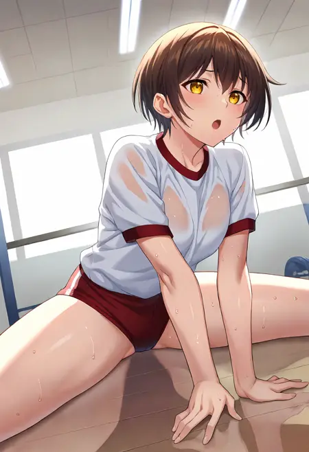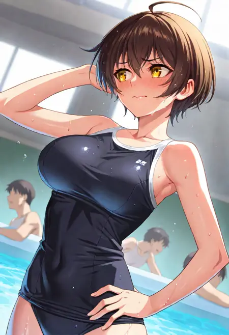 • brown hair , ( medium hair ) , ( dark ) yellow eyes / brown eyes , ( ahoge ) ;