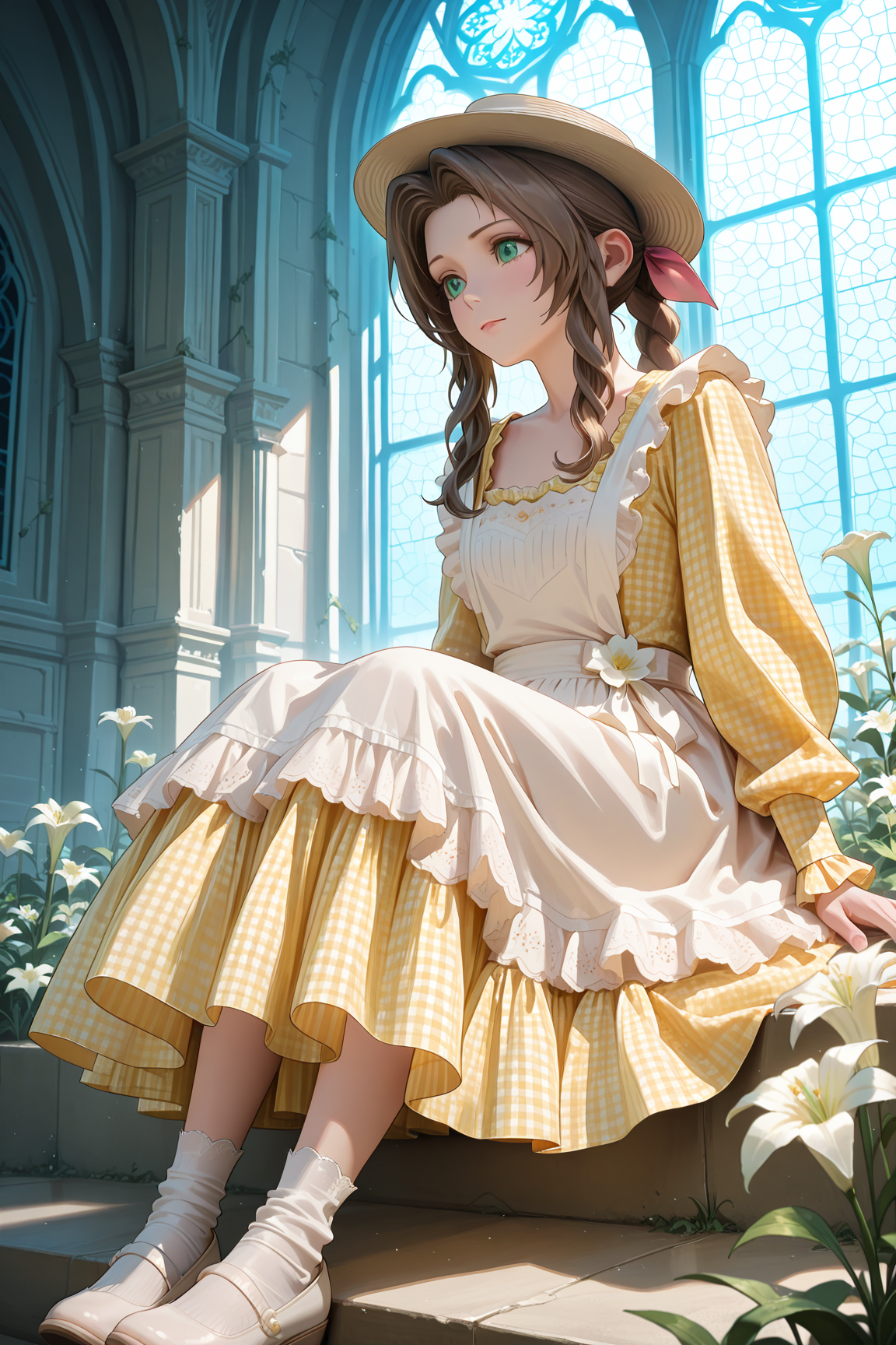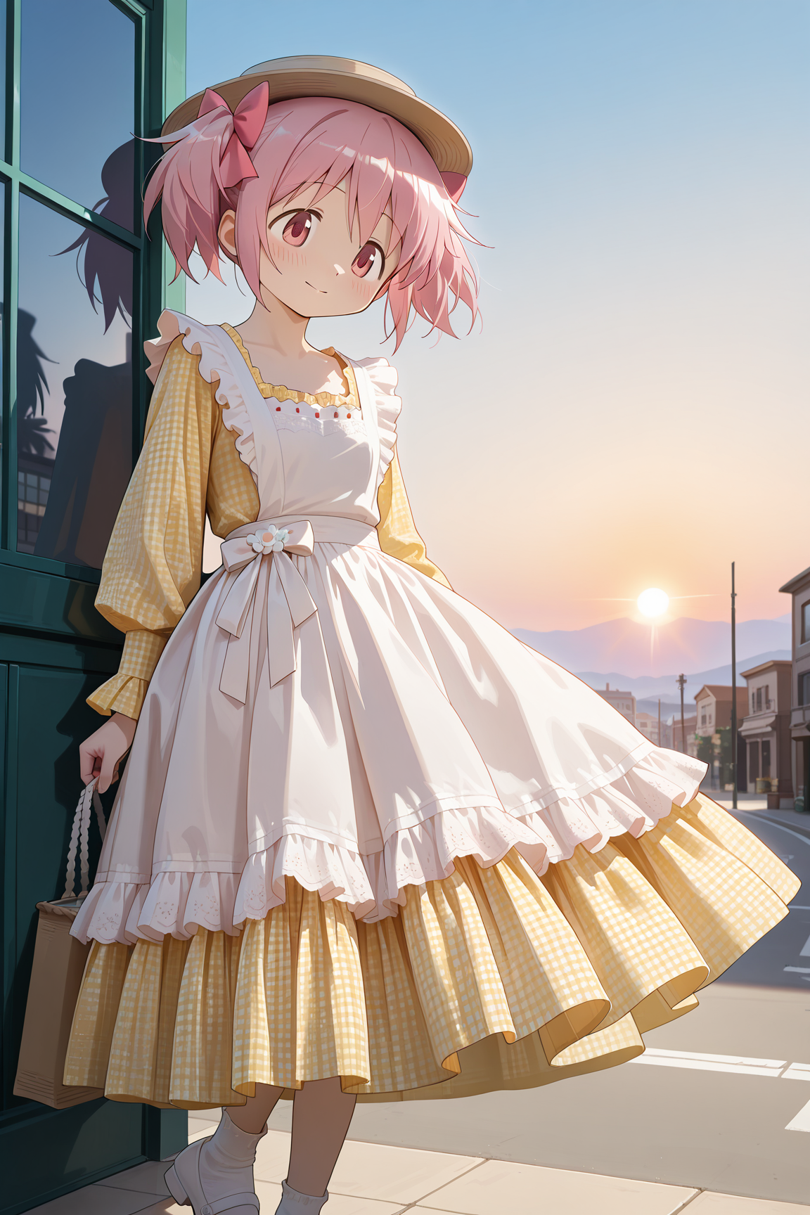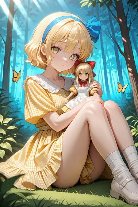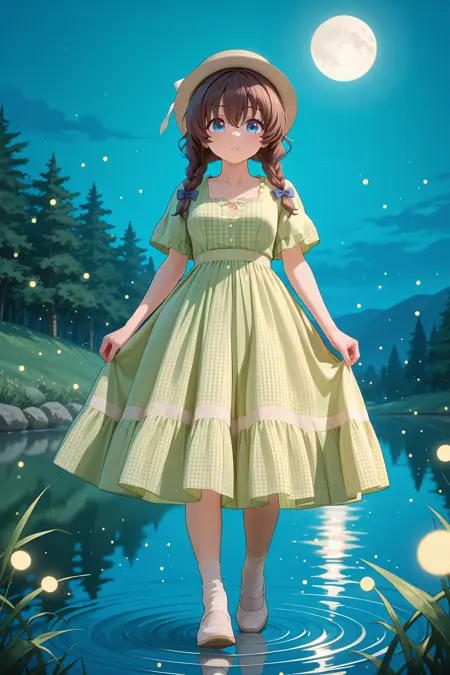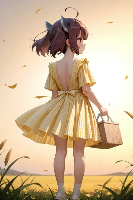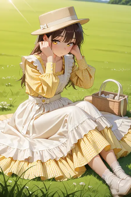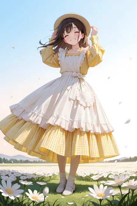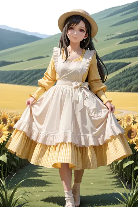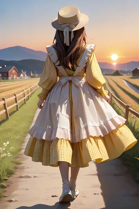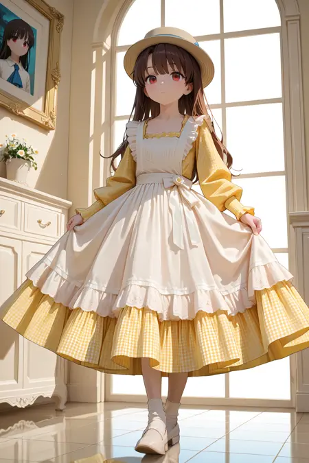 이 LoRA는 노랑색의 기ང엄 무늬 드레스와 프릴이 달린 에프론을 재현합니다.