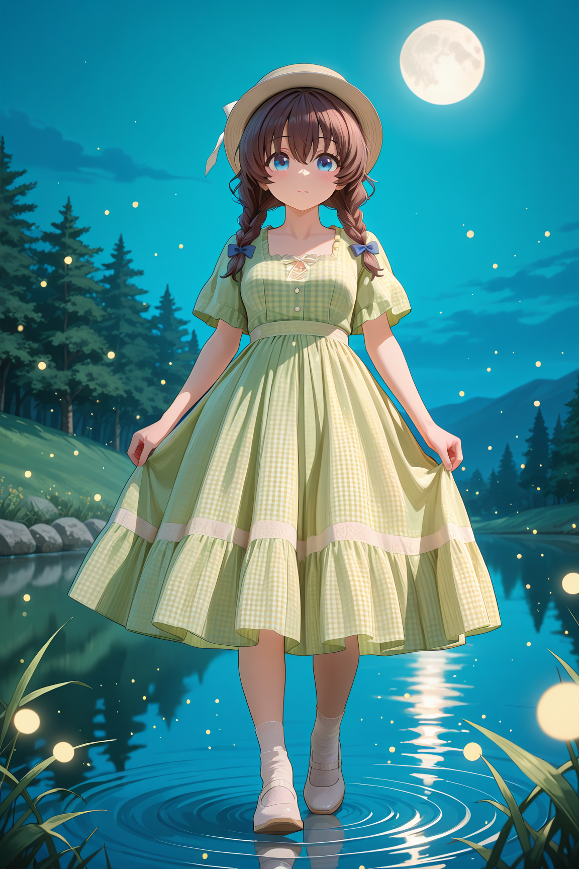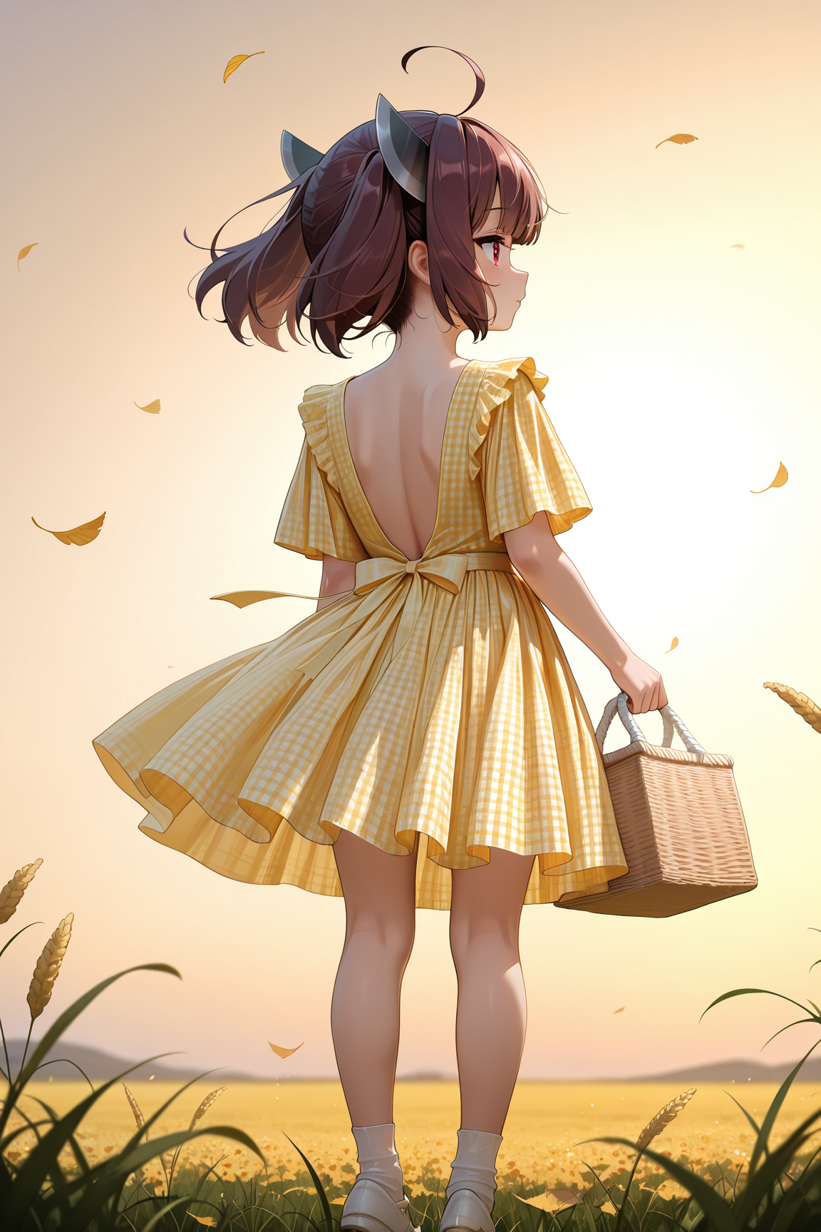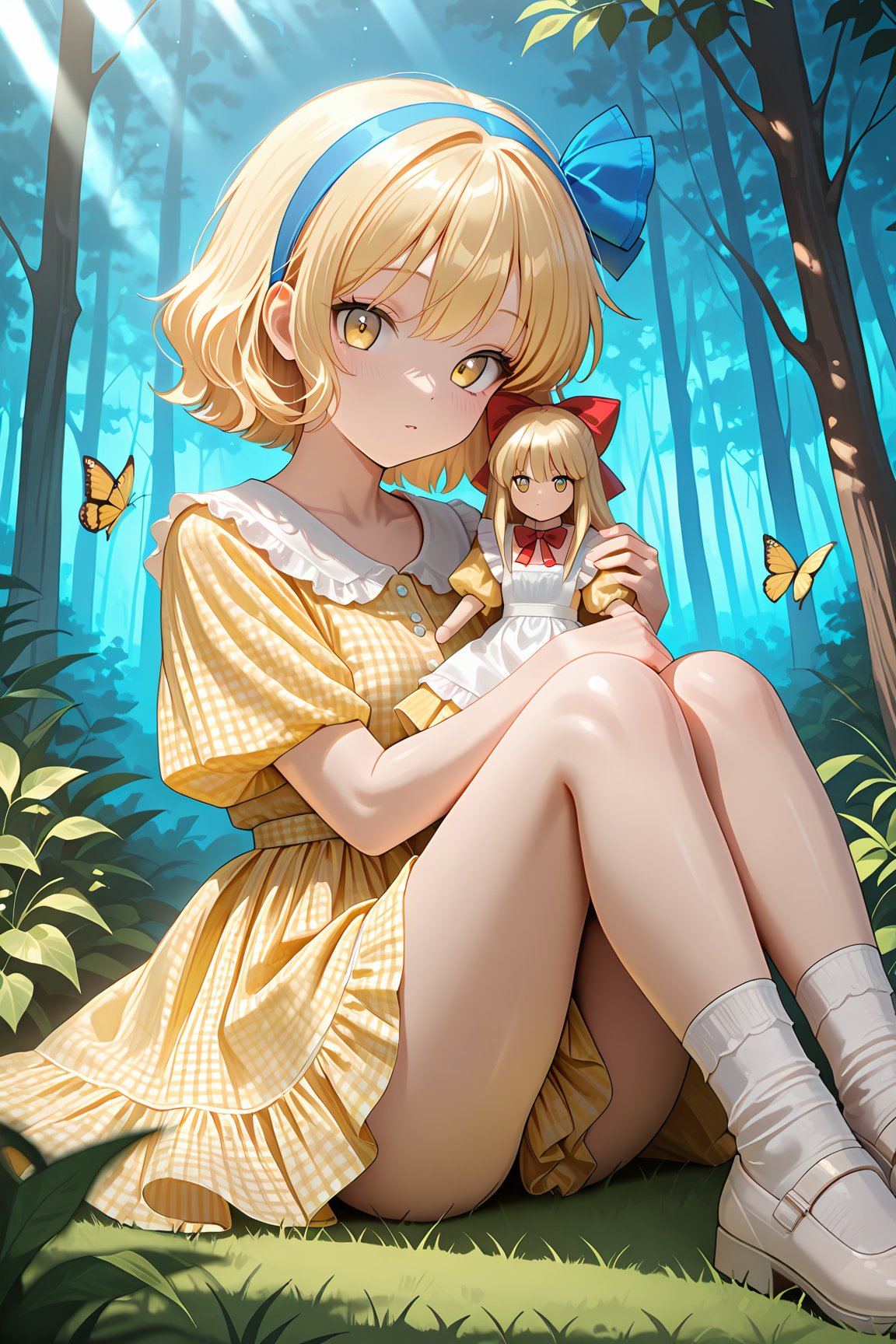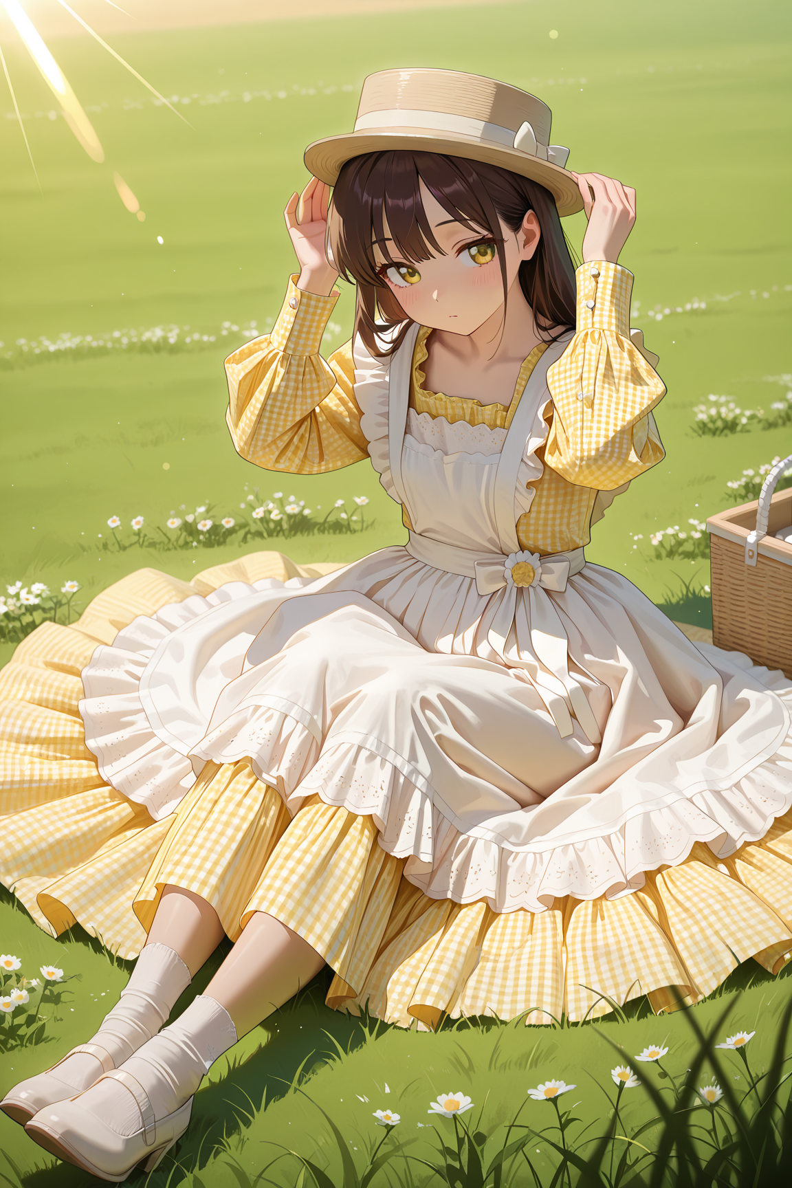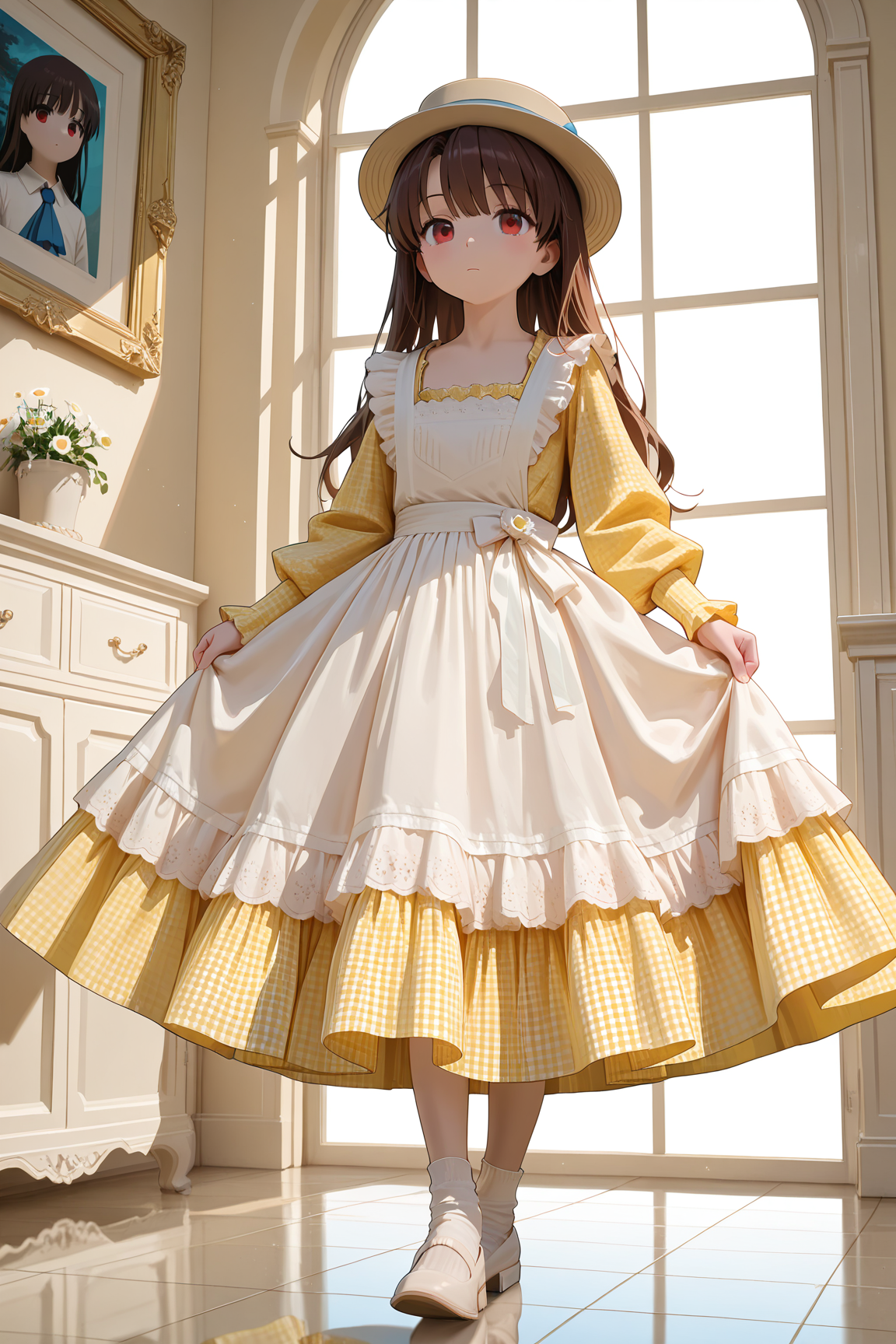 yellow_girly_dress,gingham_dress,long dress,solo,yellow dress,white sock,white footwear,