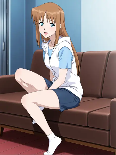 의상 단어(임시): white hoodie, hood down, short sleeves, blue t-shirt, blue pencil_skirt, white socks, sneakers,