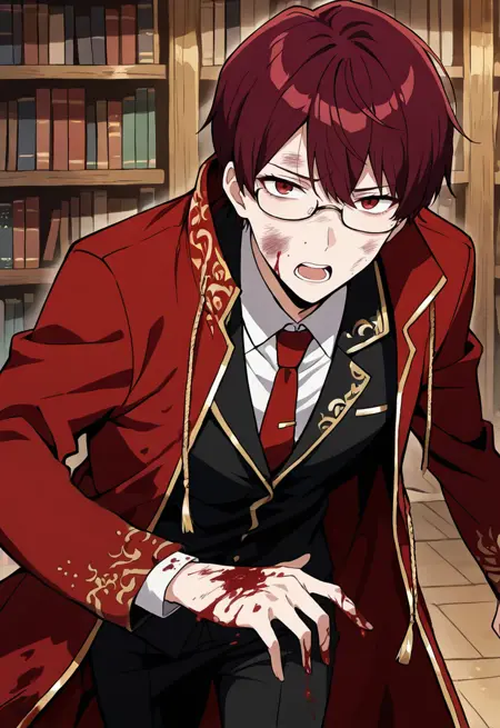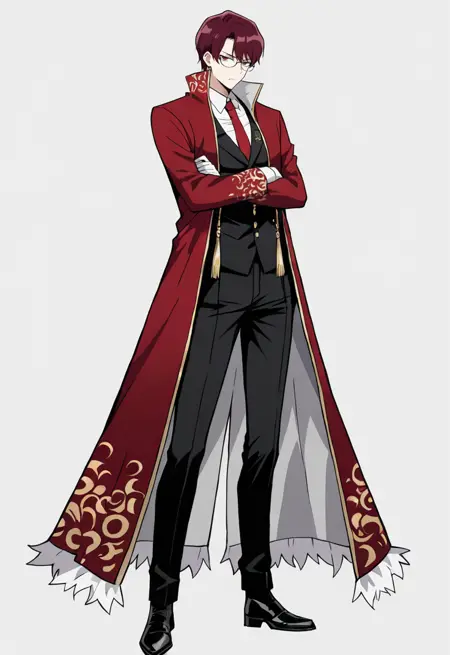 white shirt, red necktie, black jacket, red coat, high-neck coat, gold trim, black pants, black footwear