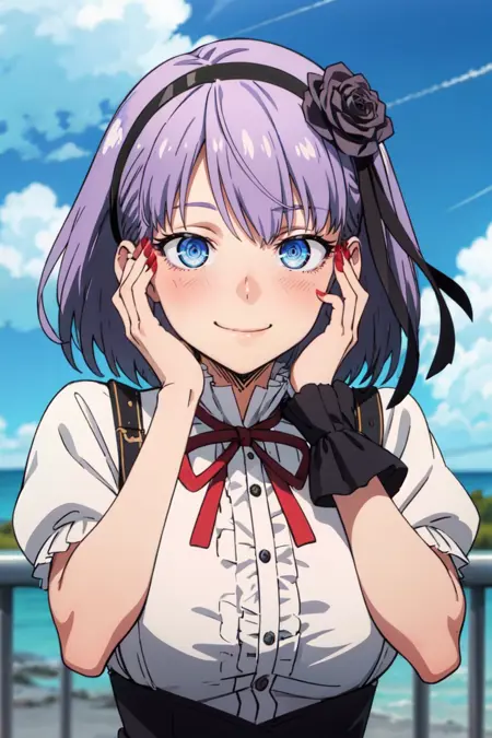For her original outift use tags: pikkyhotaru, 1girl, solo, looking at viewer, purple hair, short hair, ringed eyes, blue eyes, breasts, large breasts, hairband, hair ornament, hair flower, bow, ribbon, suspenders, skirt, high-waist skirt, frills, hair ribbon