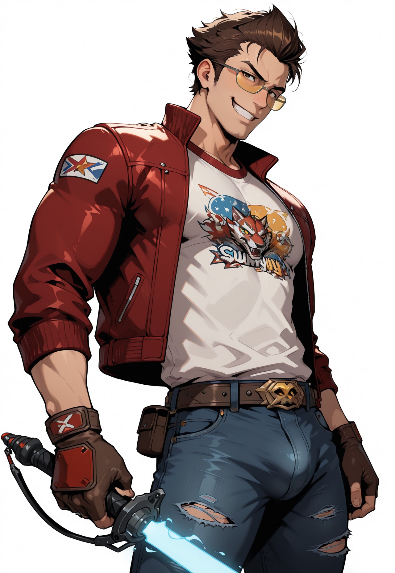 Travis, brown hair, brown eyes, yellow glasses, jeans, jacket, white shirt, fingerless gloves, energy sword, holding sword, torn clothes, belt