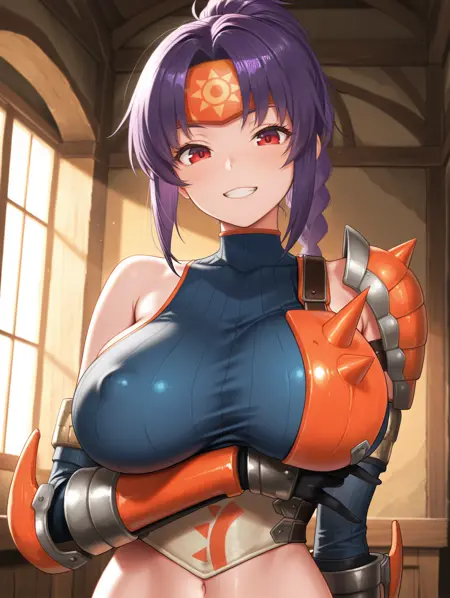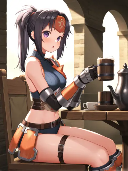 标签(服装 - 可更改颜色):黑衣甲、橙色额护、单肩甲、蓝色无袖高领衣、橙色胸甲、铠甲束腰、橙色护手、棕色腰带、橙色护腹、蓝色布鲁马裤、黑色过膝袜、银色铠甲靴