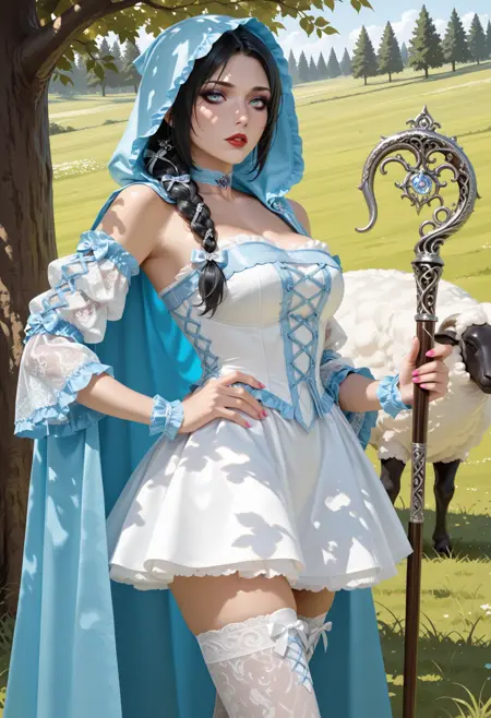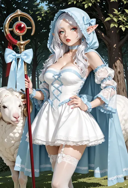 white dress, thighhighs, thighbows, decorative bows, zettai ryouiki, blue cuffs, makeup, detached sleeves, blue frills, lace sleeves, cross-laced clothing, strapless, choker, oversized bonnet, frilled bonnet, blue bow, large bow, center bows, pink nails