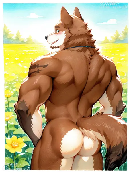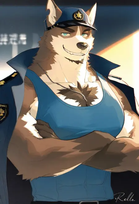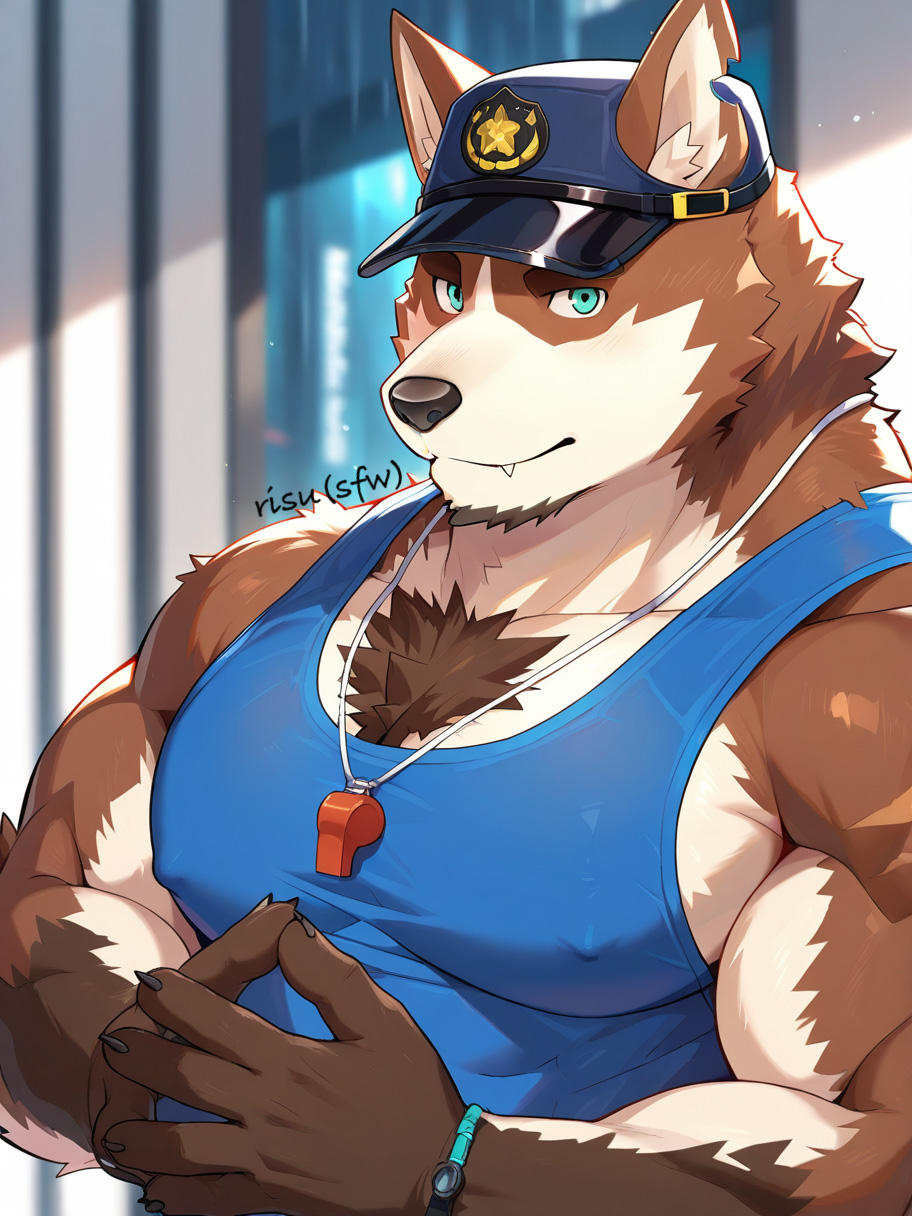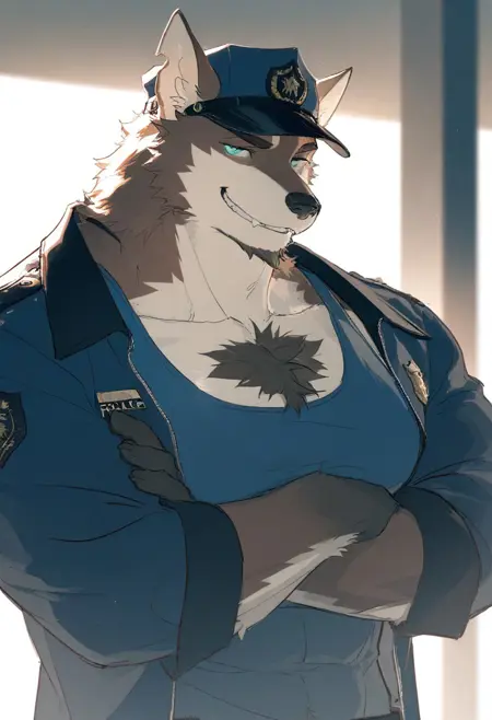 プロンプト: 犬の少年、上半身裸、大きな胸筋、腹筋、胸毛、筋肉質、ひげ、 teal の目、灰色の毛、茶色の毛、二色毛、切り耳、腕の傷跡、警察