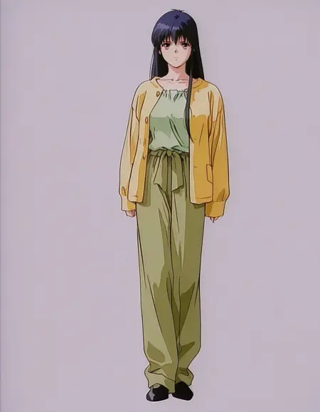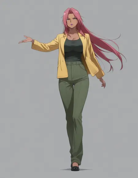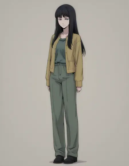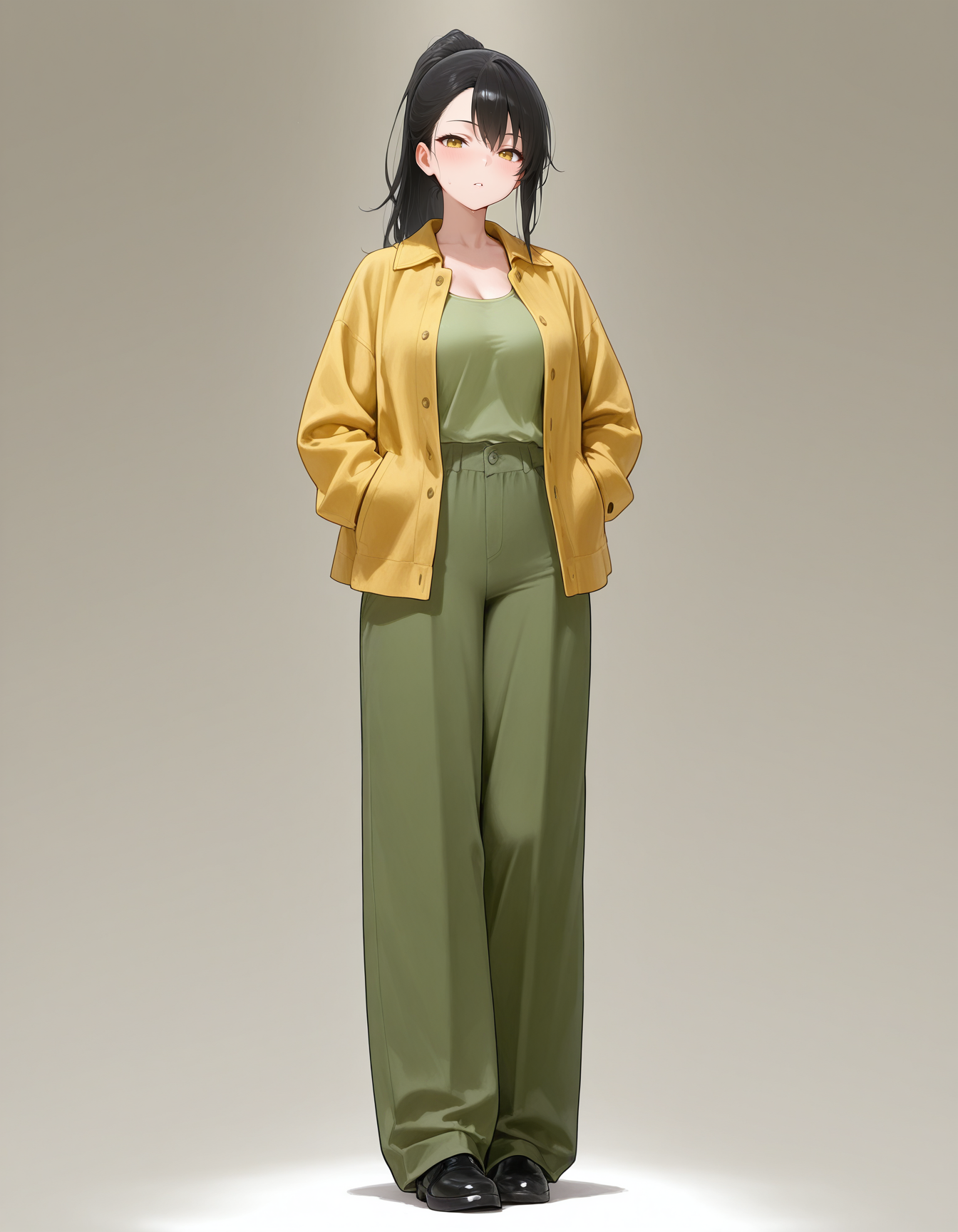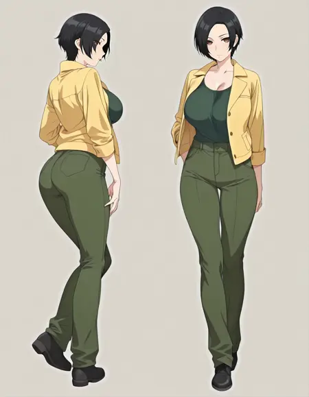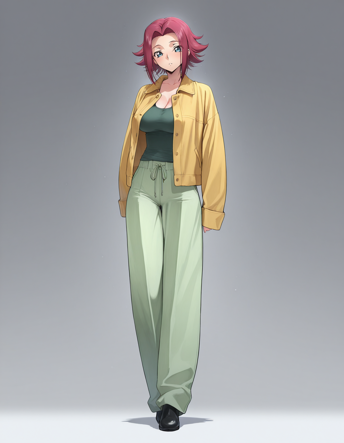 mai_yellow_jacket,green_tank_top,green_pants,black_footwear