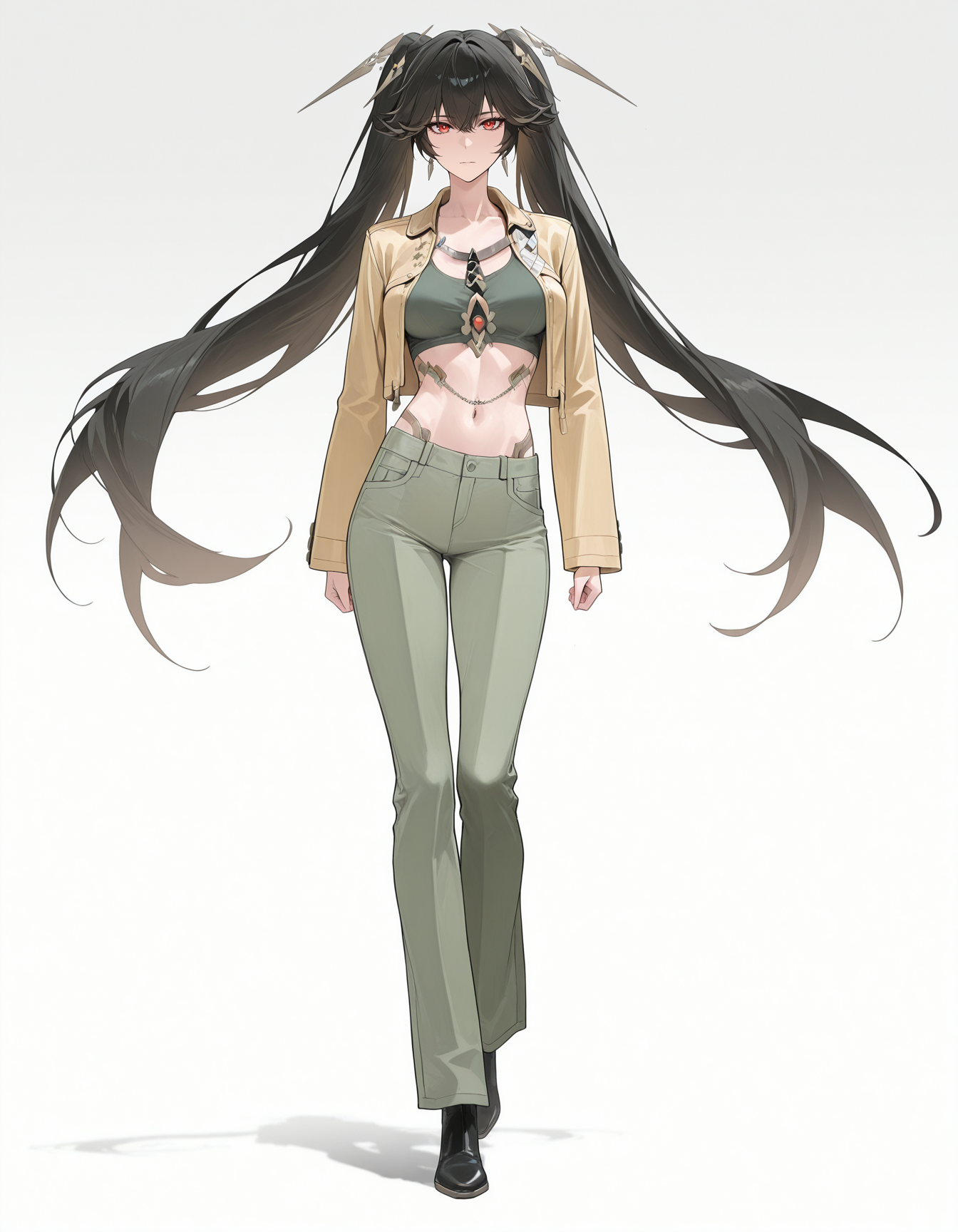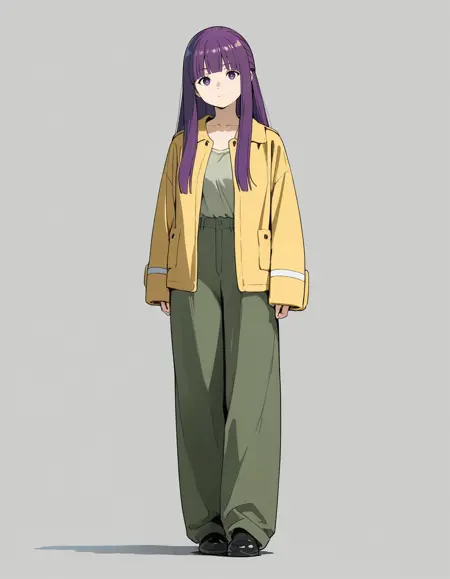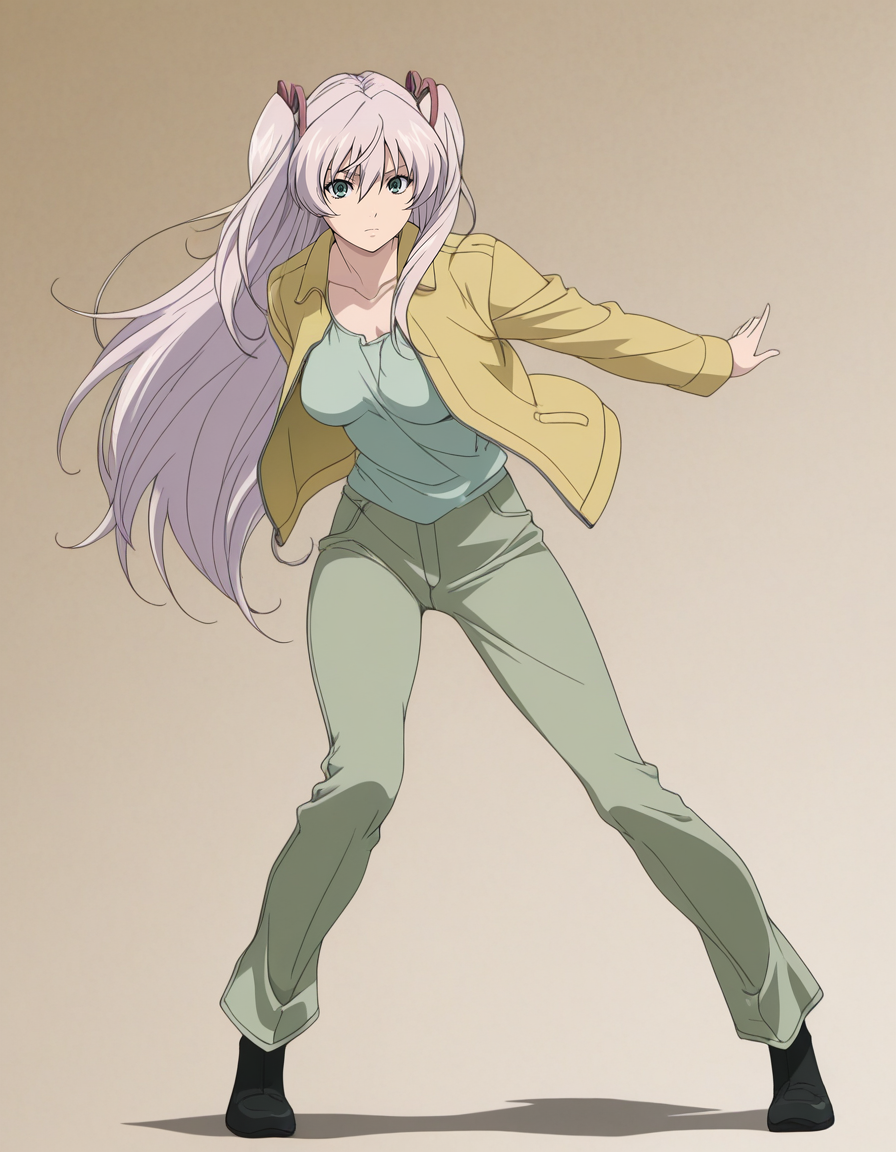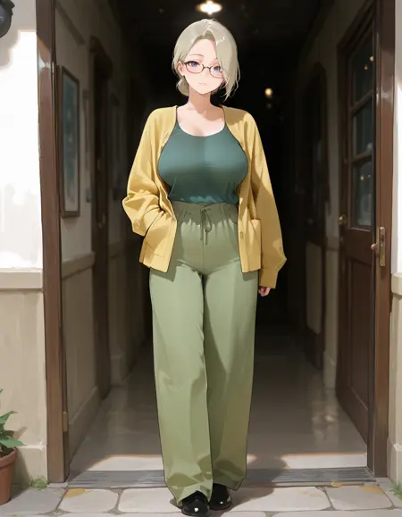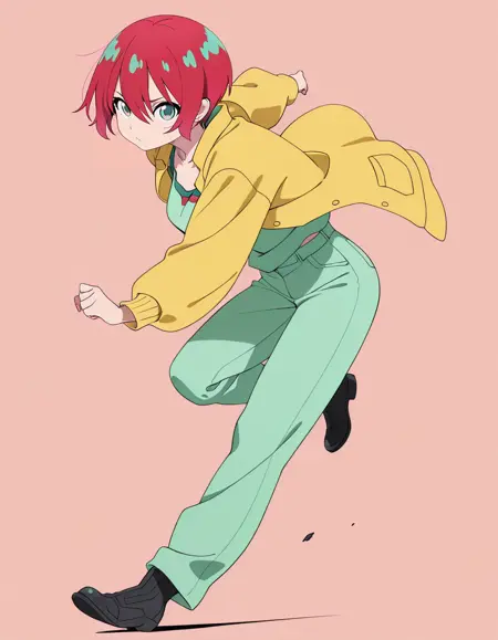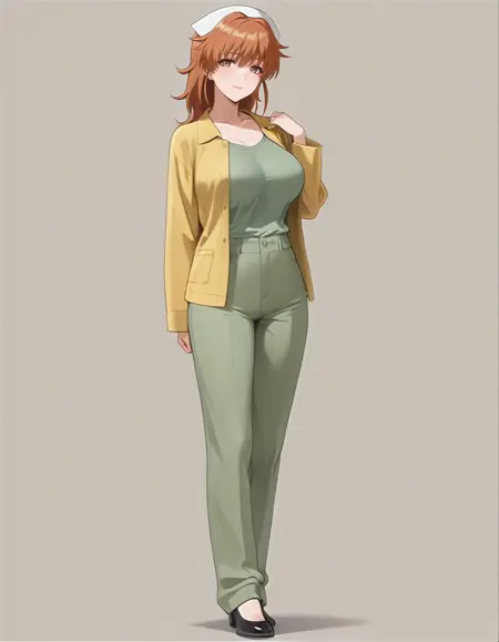 mai_yellow_jacket,green_tank_top,green_pants,black_footwear