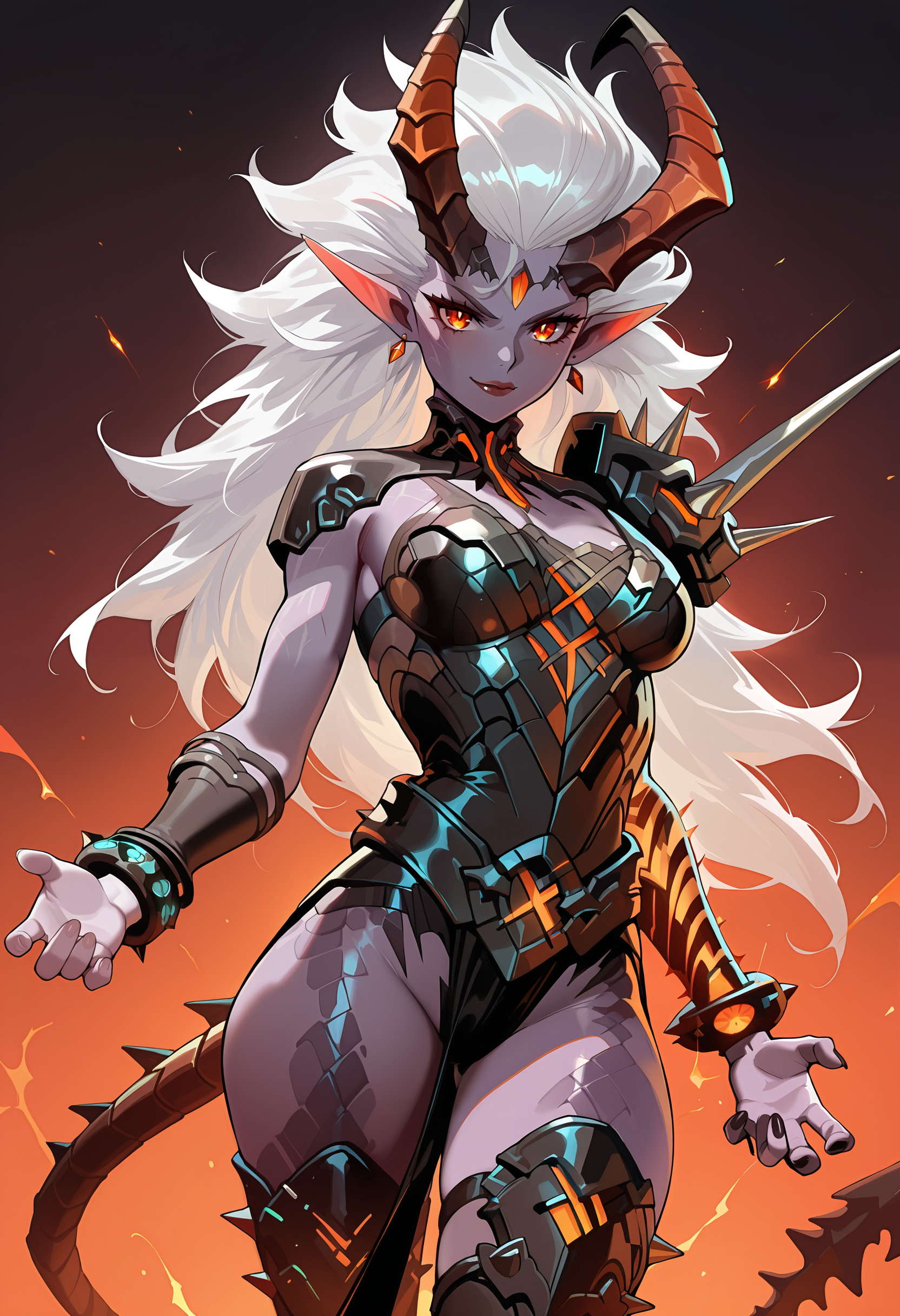 darkmagic, 1girl, horns, holding weapon with one hand, one weapon, solo, colored skin, pointy ears, armor, long hair, sword, breasts, red eyes, white hair, tail, purple skin, jewelry, looking at viewer, tattoo, smile, shoulder armor, planted, spikes, large breasts, thighhighs, greaves