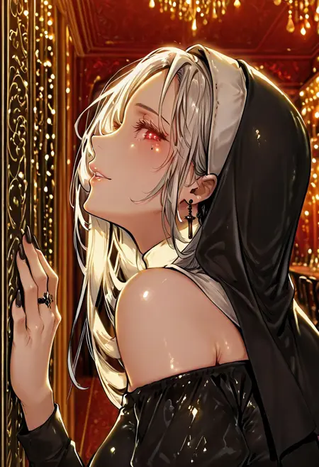 (黑色修女服,配白色面纱和黑色头巾,黑色头巾,白色面纱,白色手套,银色耳环,)金色十字架项链,性感黑色内裤,黑色过膝长筒袜,