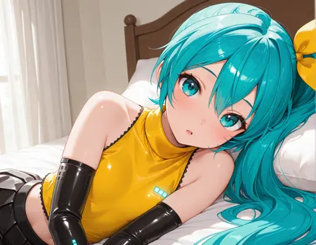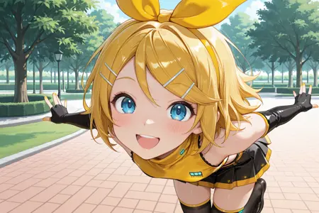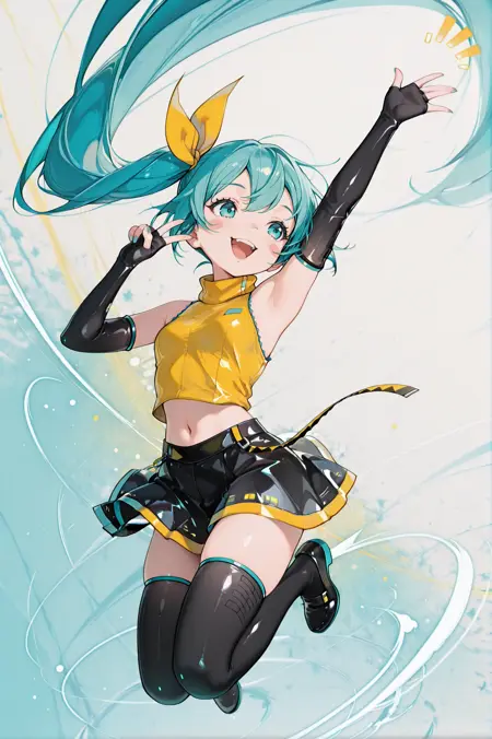 중요 태그: 옆머리 단발, 노란 리본, 노란 무소매 터틀넥, 검은 치마, (노란 치마: 0.3), 검은 허벅지 양말, 검은 팔꿈치 무지手套, 복부, 배꼽, (검은 셔츠: 0.3)