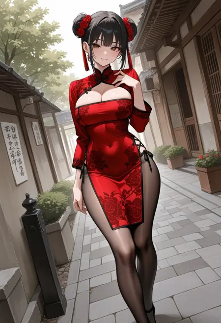 dark red rose print outfit (neck, sleeves, Qi-Pao mini dress, leggings, t-strap heels)