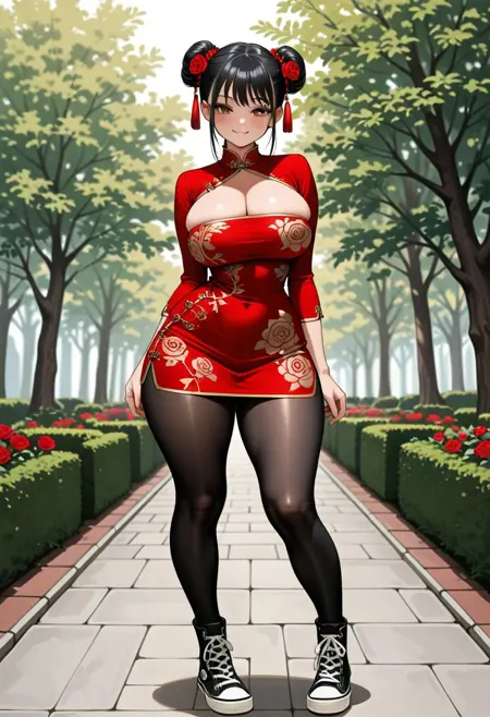 dark red rose print outfit (neck, sleeves, Qi-Pao mini dress, leggings, converse heels)
