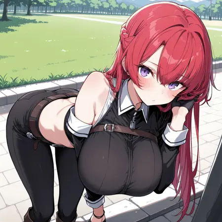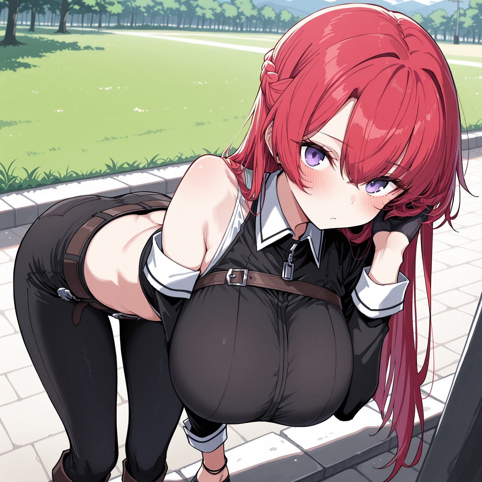 color: lisaill, purple eyes, red hair, braid, 1girl, long hair, large breasts. lisadef, black pants, detached sleeves, belt, jacket, black jacket, half gloves, knee boots, crop top, pants