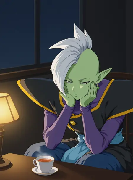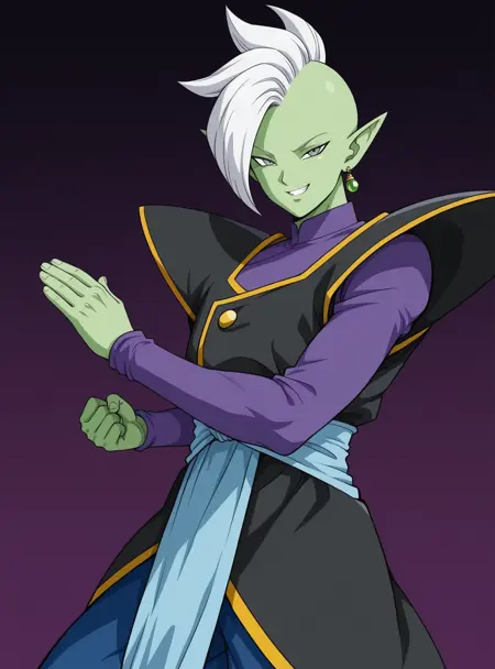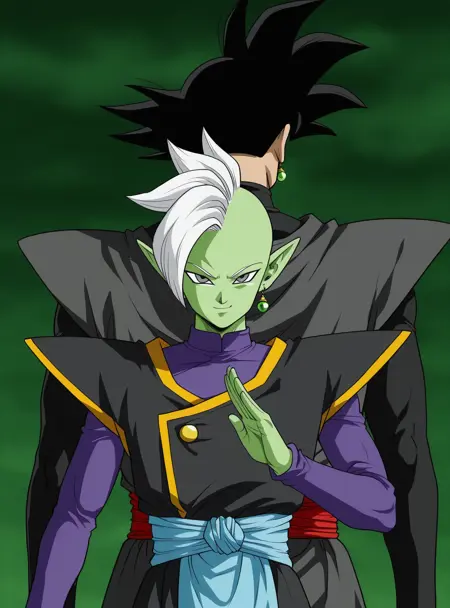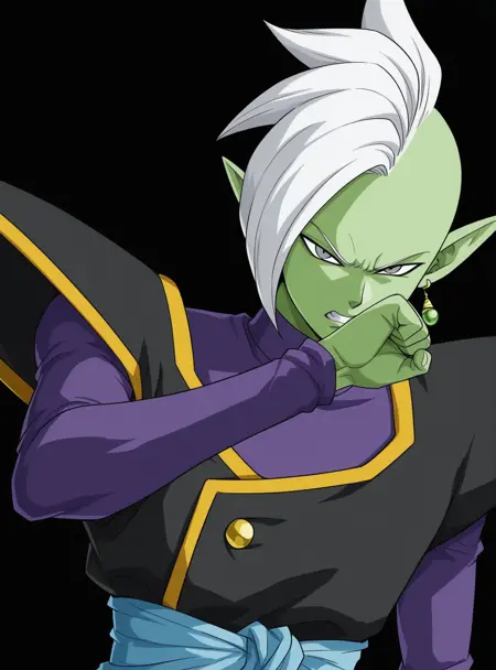 Zamasu: solo, 1boy, zamasu_d, 色付き肌, 緑色の肌, モハawk, 白髪, 灰色の目, 黒い瞳, 尖った耳, ポタラ耳飾り, 単一の耳飾り, 緑色の耳飾り, 紫色のシャツ, 長袖, チュニックの下にシャツ, 黒いチュニック, 肩パッド, 黄色の縁取り, 金色のボタン, 青い帯, ゆったりしたズボン, 青いズボン, ブーツ, 白い靴下,