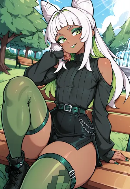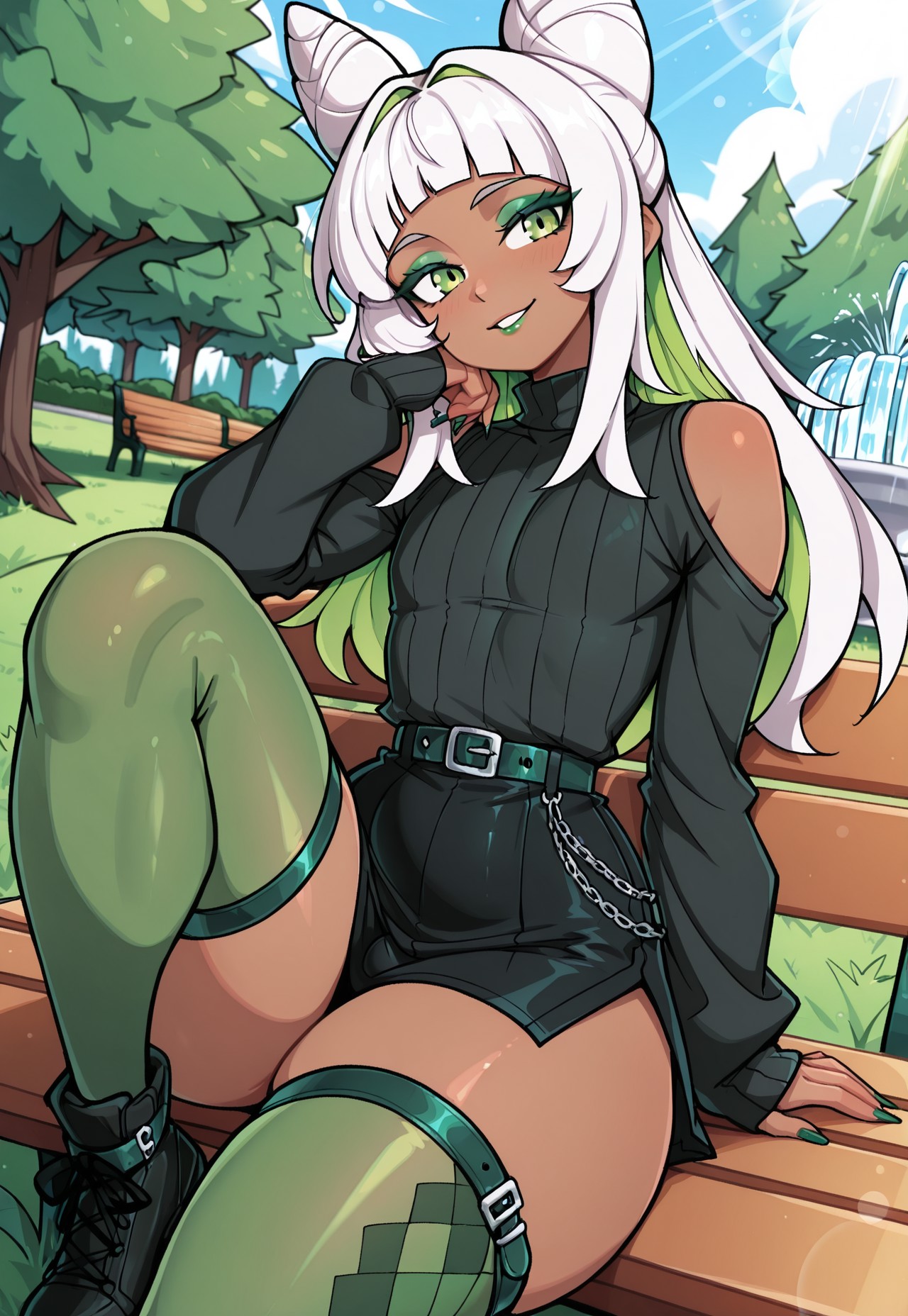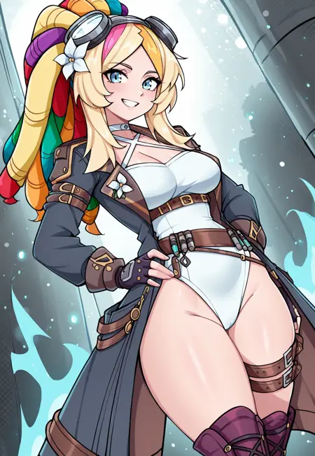 nuer,金髪,レインボーヘア,ダレック,青い目,ポニーテール,分け目のある前髪,長い髪,頭にゴーグル,花の装飾,