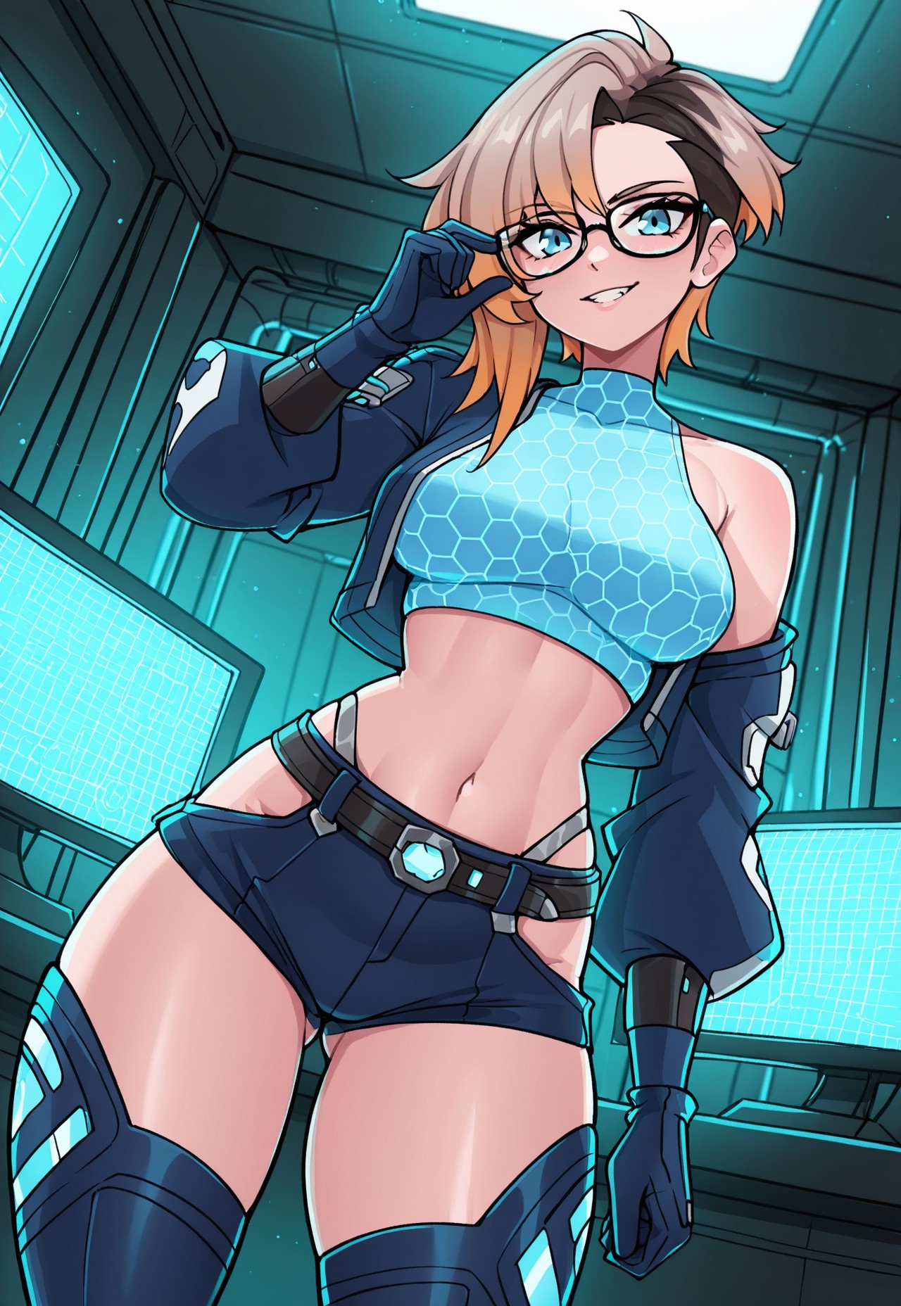 dogni,暗い肌,犬の耳,犬の尾,オレンジ色の目,青い髪,ふわふわした髪,ほくろ,おへそピアス,