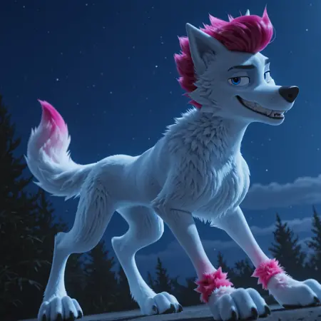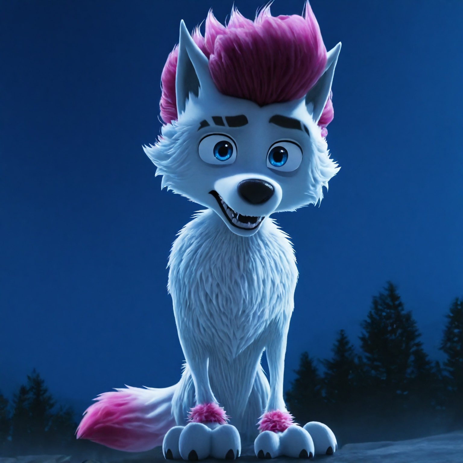Freddy, solo, 1boy, furry, wolf, pink hair, black eyebrows, eyebrow slit, black nose, blue eyes, white tail with pink at the end, pink wrist fur, white fur,
