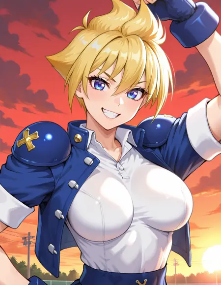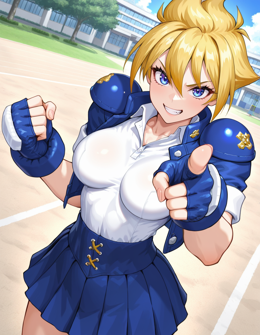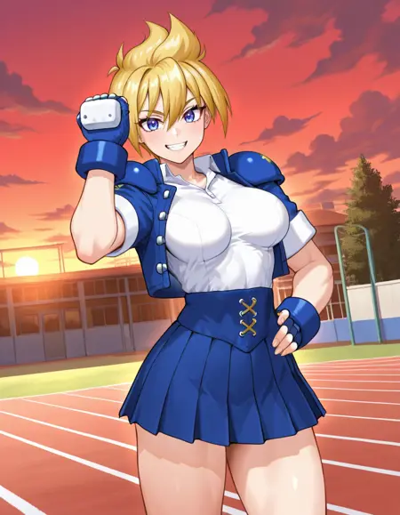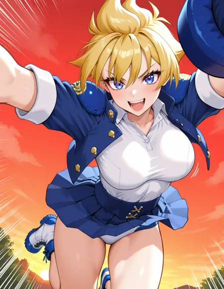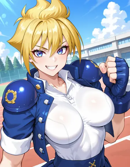 | 학습된 단어 | (mikazuchi-raiya), (dark blue eyes, eyelashes, blonde hair, spiked hair, short hair, large breasts), (blue cropped jacket, white collared shirt, blue shoulder armor, short sleeves, blue pleated skirt, miniskirt, blue fingerless gloves, blue cross-laced footwear), (white buruma)복사됨! |