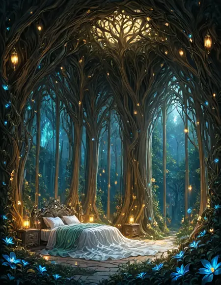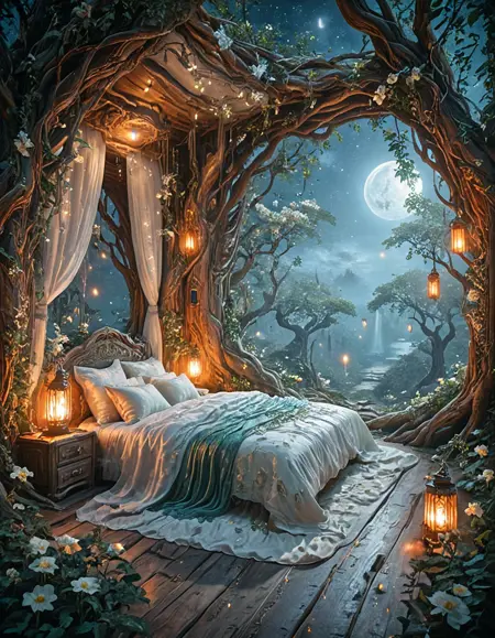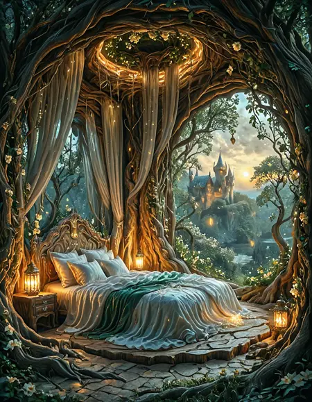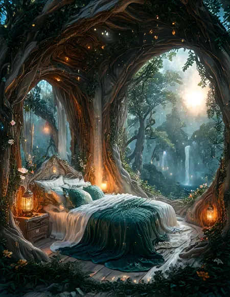 古代の木の内部にある優雅なエルフ風の寝室、生物発光の脈を伴う輝く木製の壁、月明かりの森に開くアーチ型のクリスタル窓、シルクのシーツが敷かれた天蓋ベッド、魔法の光を放つ浮遊ランタン、ツルと輝く花、静かな神秘的な雰囲気、ファンタジー現実主義、きわめて繊細な描写、