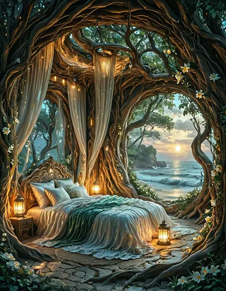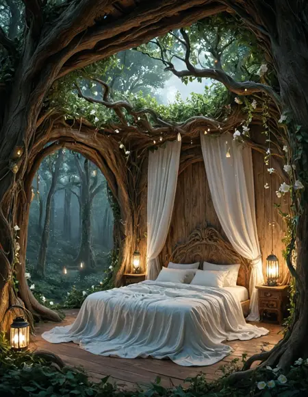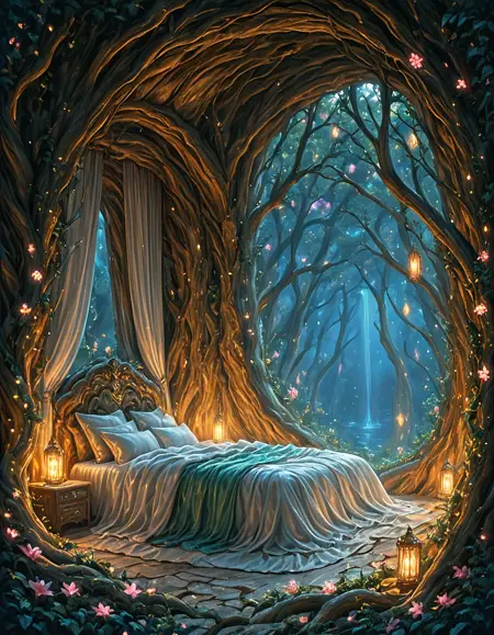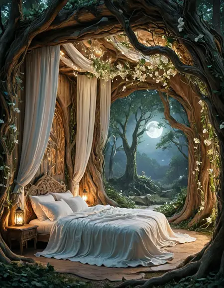 고대 나무 안에 있는 우아한 엘프틱 침실, 생체 발광 정맥이 흐르는 빛나는 나무 벽, 달빛이 비치는 숲으로 열린 아치형 크리스탈 창문, 실크 침구가 깔린 천정 침대, 마법적인 빛을 비추는 떠다니는 등불, 덩굴과 빛나는 꽃들, 고요한 신비로운 분위기, 판타지 리얼리즘, 매우 상세하게