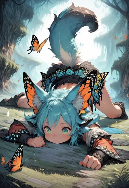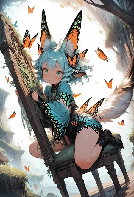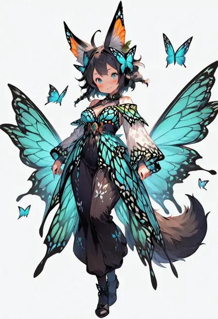 1girl, (solo:1.2), (Fantasy world style, blank background:1.2), dynamic pose, (Animal ears:1.2), tail, (Cute style:1.2), rabbit, butterfly