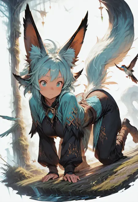 1girl, (solo:1.2), (Fantasy world style:1.2), cute style, dynamic pose, (Animal ears:1.2), tail, (Cute style:1.2), fox