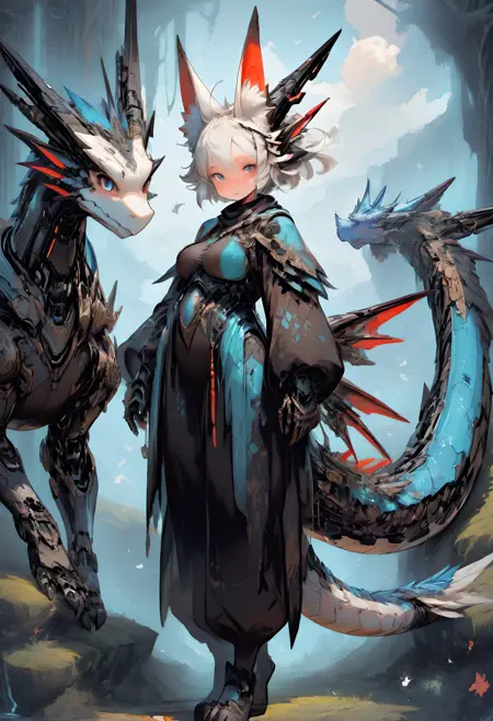 1girl, (solo:1.2), (Fantasy world style:1.2), cute style, dynamic pose, (Animal ears:1.2), tail, (Cute style:1.2), mouse, dragon, horns, wings