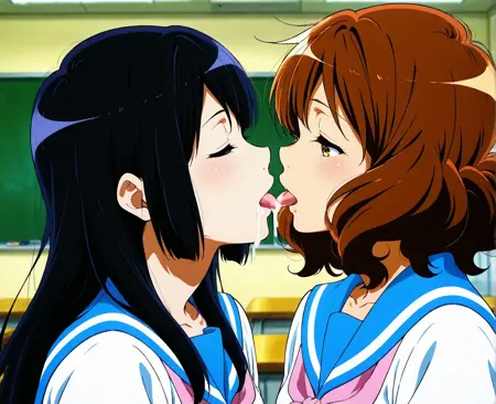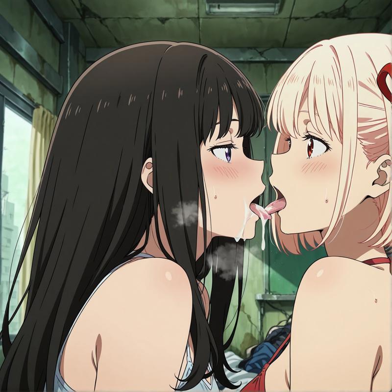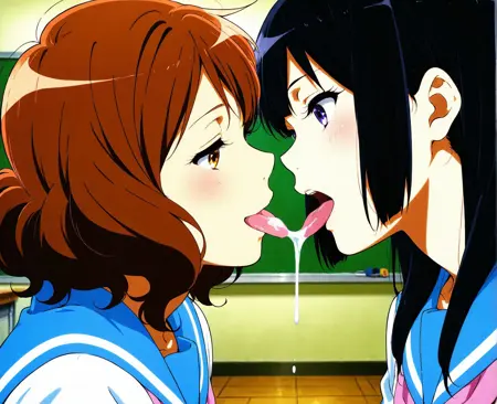 2人の少女、ユリ、舌を出す、キス、精液の口から口への交換、精液交換、