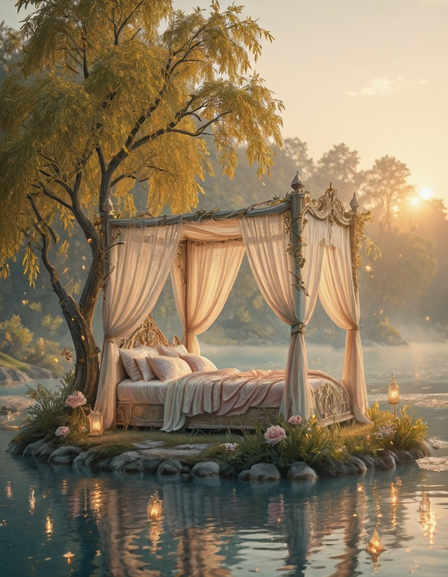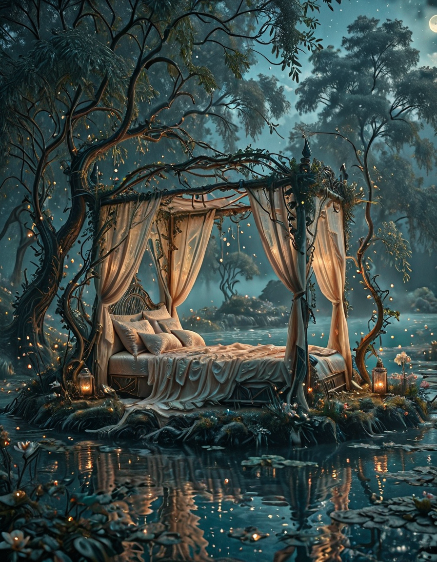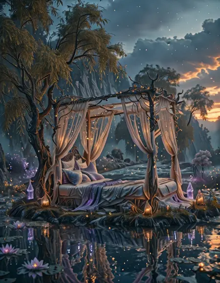 创建一个室内精灵或精灵风格的卧室,窗外是您选择的户外场景。默认为带有或不带瀑布的夜晚森林场景。