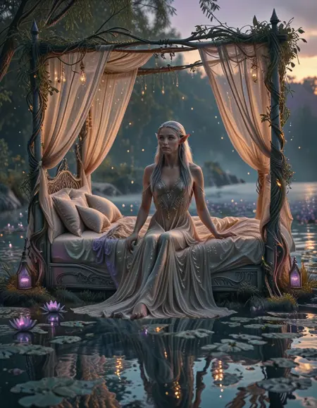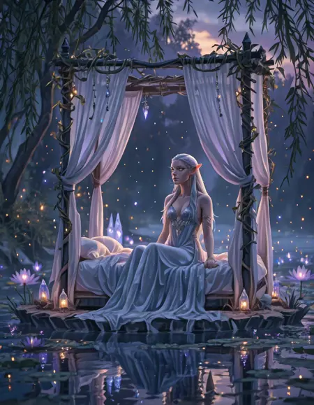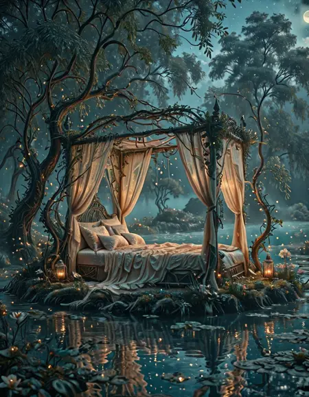 一座位于古老树木内部的优雅精灵卧室,发光的木质墙壁带有生物荧光纹理,拱形水晶窗面向月光下的森林,丝质床单的四柱床,漂浮的灯笼投射出魔法般的光芒,藤蔓与发光花朵,宁静神秘的氛围,幻想现实主义,高度细节化,
