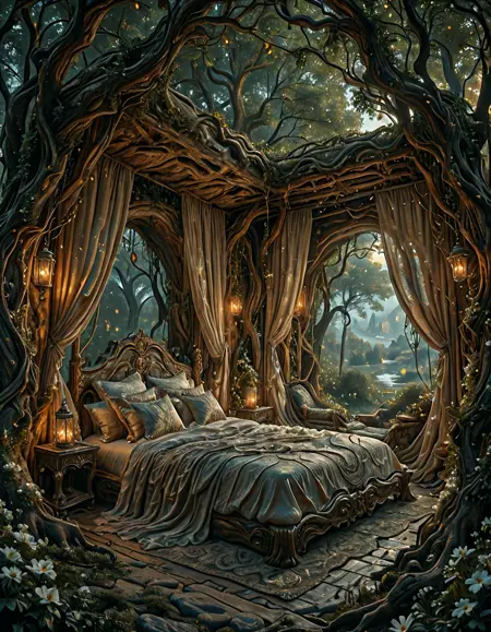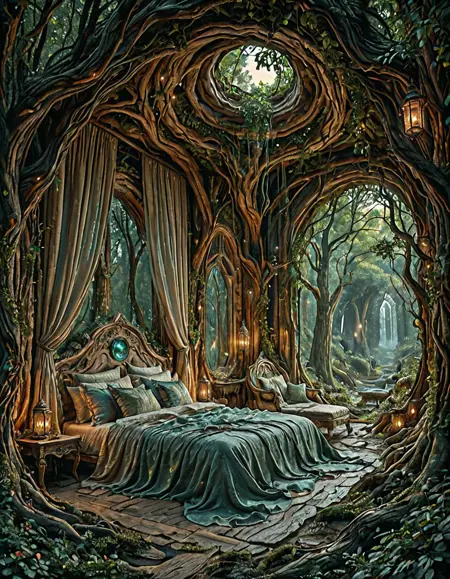 一座位于古老树木内部的优雅精灵卧室,发光的木质墙壁带有生物荧光纹理,拱形水晶窗面向月光下的森林,丝质床单的四柱床,漂浮的灯笼投射出魔法般的光芒,藤蔓与发光花朵,宁静神秘的氛围,幻想现实主义,高度细节化,
