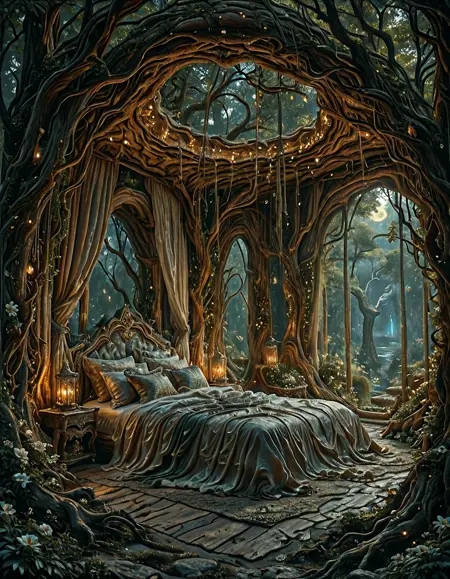 고대 나무 안에 있는 우아한 엘픽 침실, 생광맥이 흐르는 빛나는 나무 벽, 달빛이 비치는 숲으로 열리는 곡선형 크리스탈 창문, 실크 침대시트가 깔린 천정 침대, 마법적인 빛을 비추는 떠다니는 등불, 덩굴과 빛나는 꽃들, 고요한 신비로운 분위기, 판타지 리얼리즘, 매우 상세함,