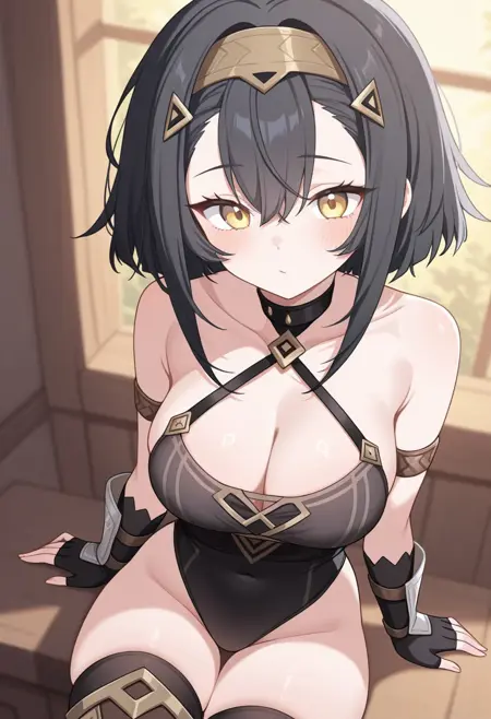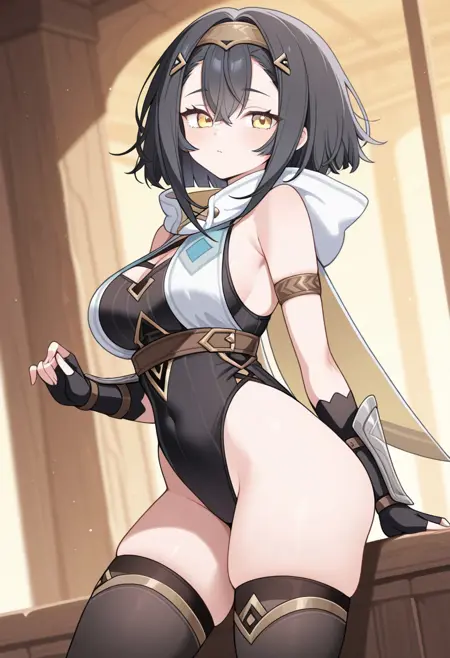1girl, kohakuStellaS, 黑发, 短发, 黄色眼睛, 发饰, 发带, 帽子下垂, 臂环, 白色连衣裙, 无侧边连衣裙, 短裙, 连体衣, 黑色连体衣, 无指手套, 黑色手套, 黑色过膝袜, 过膝袜, 大腿靴, 绝对领域